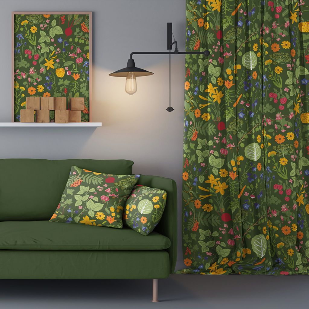 Färgglatt mönster med grön botten och blommor, grönsaker och bär, designat av Edholm Ullenius.