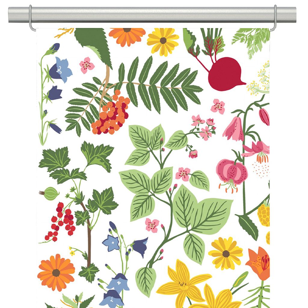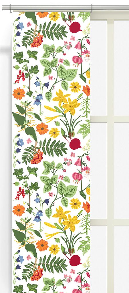 Hedemora vit panelgardiner med mönster av grönsaker, blommor, bär och blad i härligt somriga färger.
