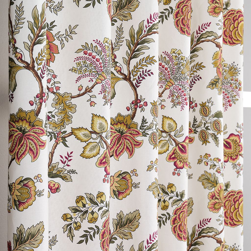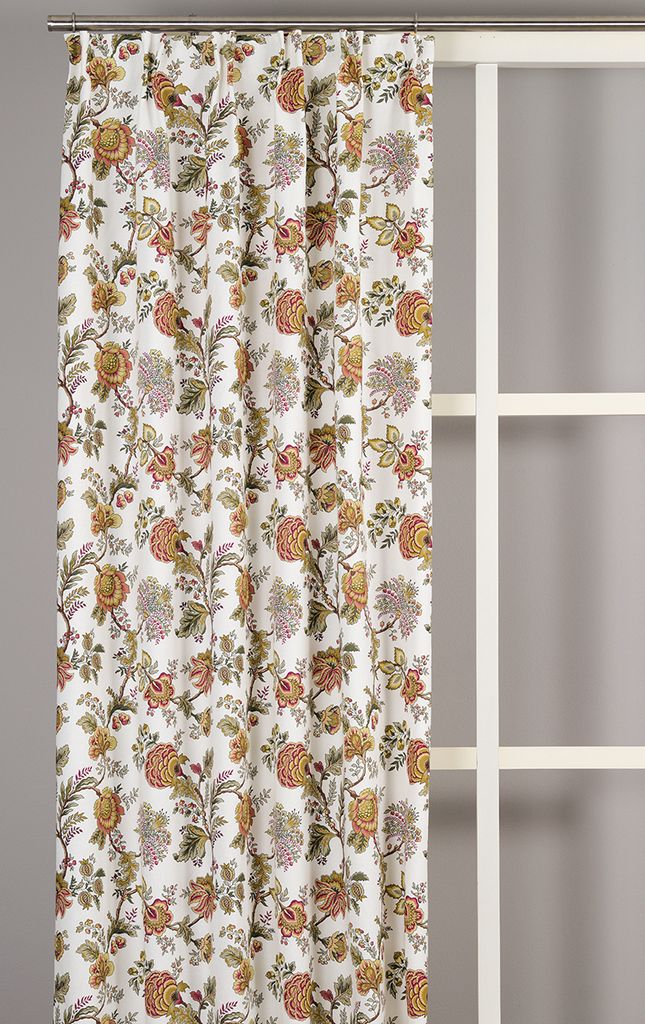 Den ljusa botten balanserar mönstret och gör att gardinerna upplevs luftiga trots sitt rika formspråk. De passar lika fint i vardagsrum som i sovrum och kök, där de bidrar med både karaktär och värme.
