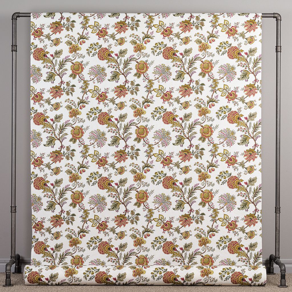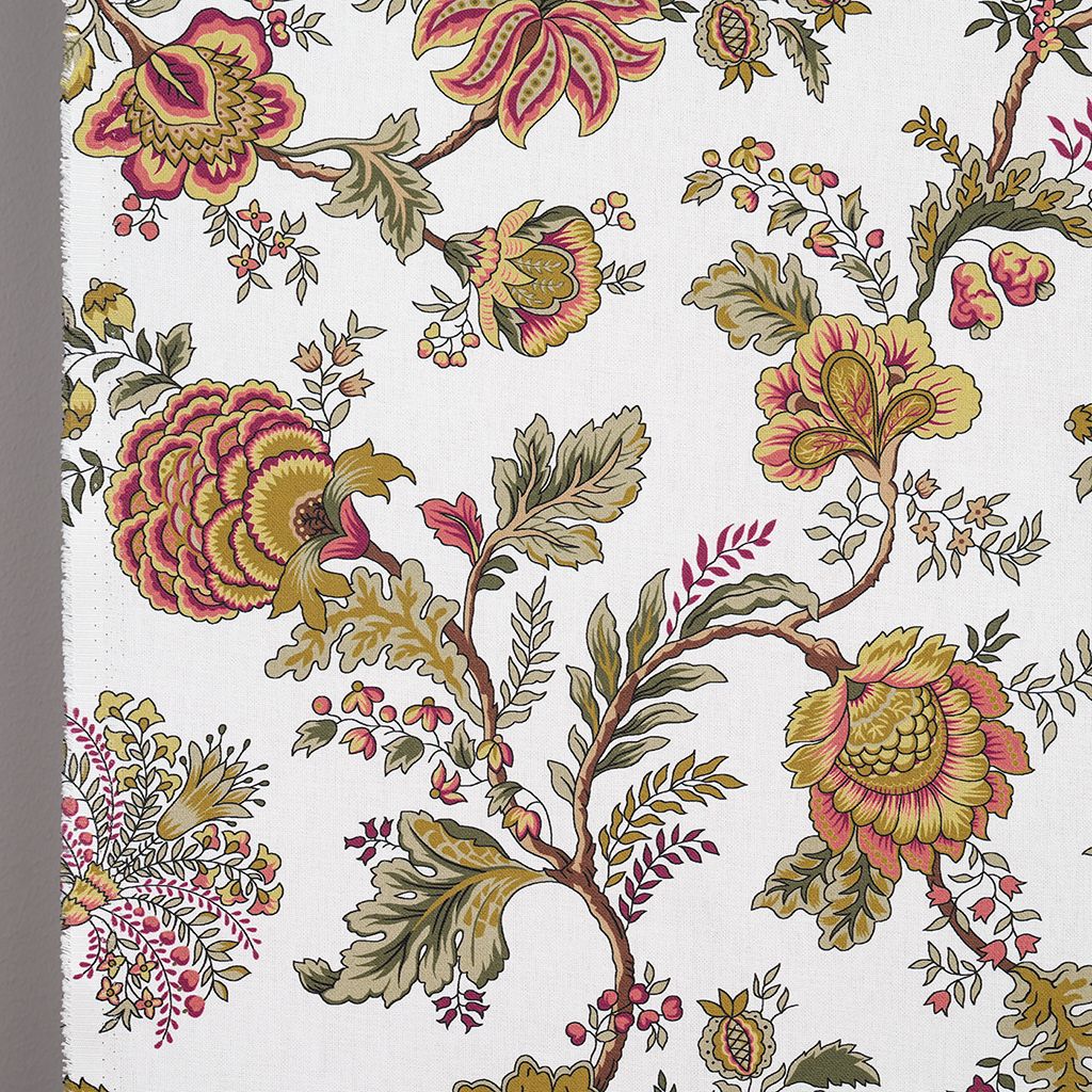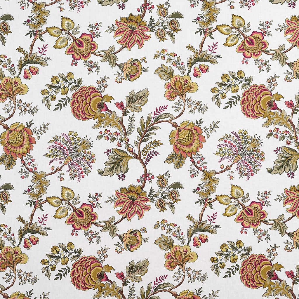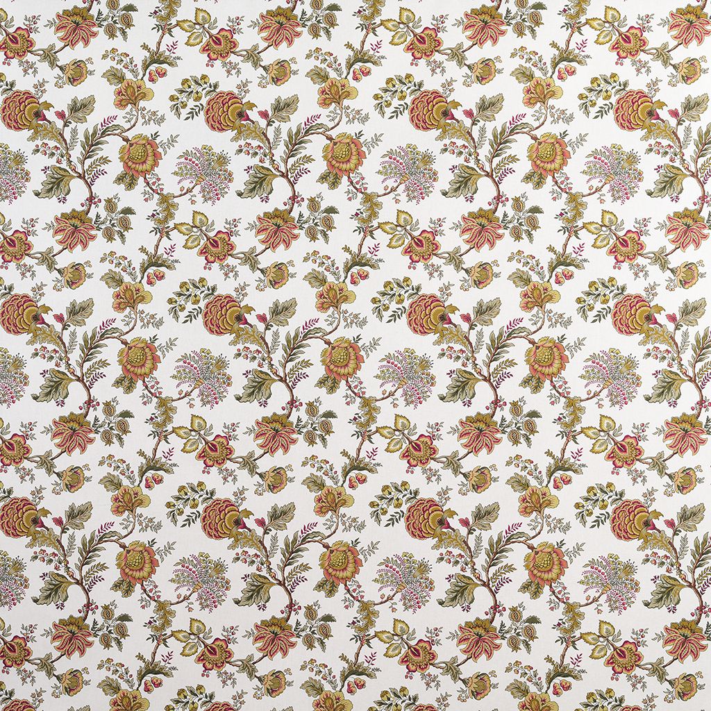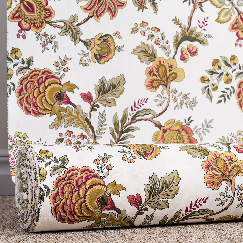 Heritage vinröd är ett elegant tyg med klassiskt blommönster i varma toner av vinrött, ockra och grönt på vit botten – perfekt för en tidlös och ombonad inredning.