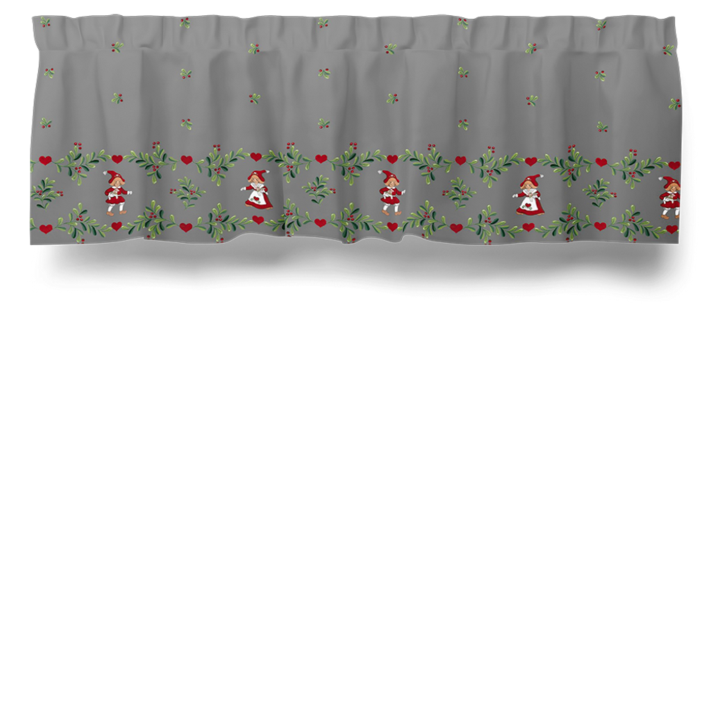 Grå gardinkappa med ett gammaldags julmotiv med tomtar och blad