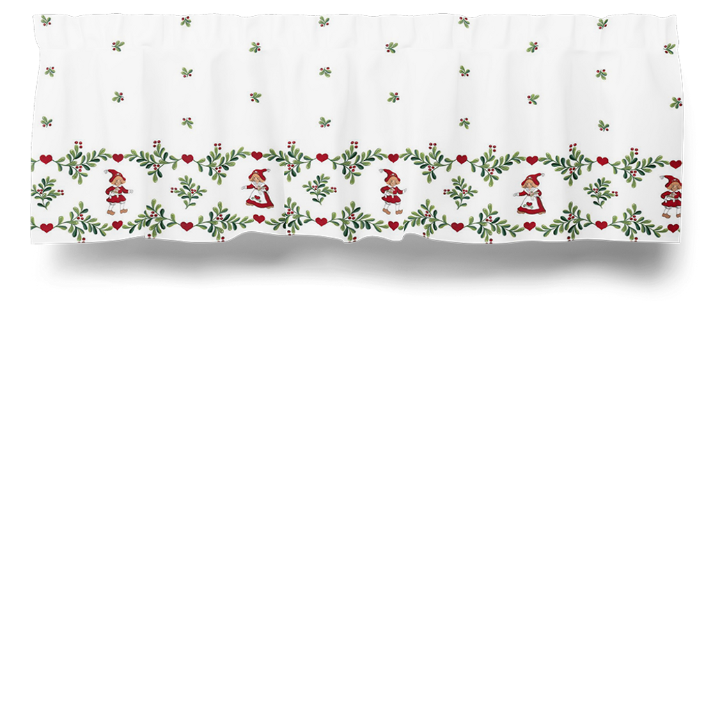 Vit gardinkappa med ett gammaldags julmotiv med tomtar och blad