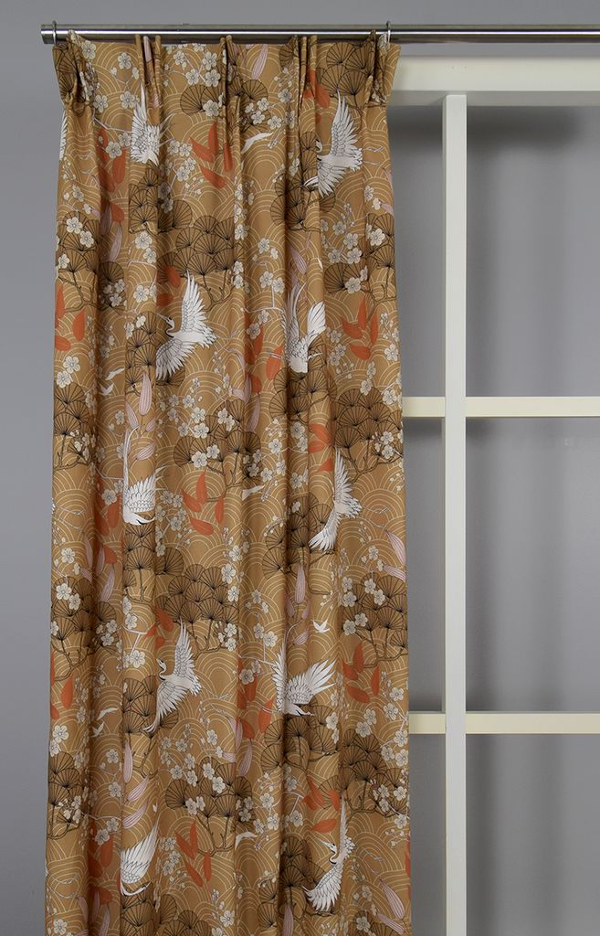 Hokkaido gardinen i nyansen bronze är en hyllning till japansk estetik med sin detaljerade design som föreställer svävande tranor, blommande kvistar och mjuka vågformer. Mönstret ramas in av varma brons- och ockratoner med kontrasterande inslag i vitt och dämpat rostrött, vilket ger textilen en elegant men jordnära känsla.