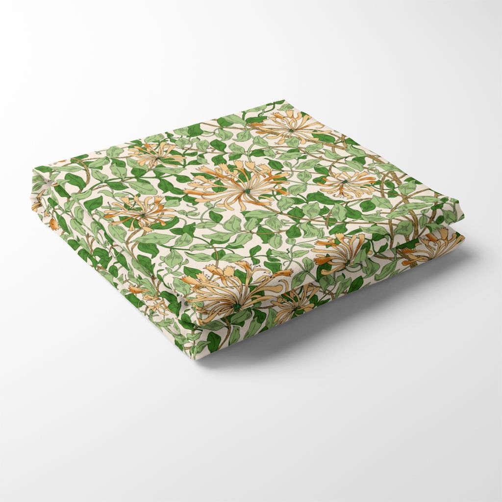 Honeysuckle aprikos bordsduk är ett underbart tillskott till det dukade bordet – perfekt för att skapa en varm, inbjudande och grönskande känsla. Mönstret hämtar inspiration från kaprifolens slingrande växtsätt, med aprikosfärgade blommor och gröna blad mot en ljus, naturtonad botten.