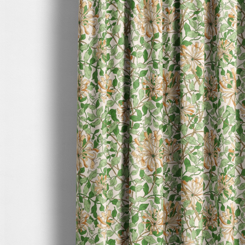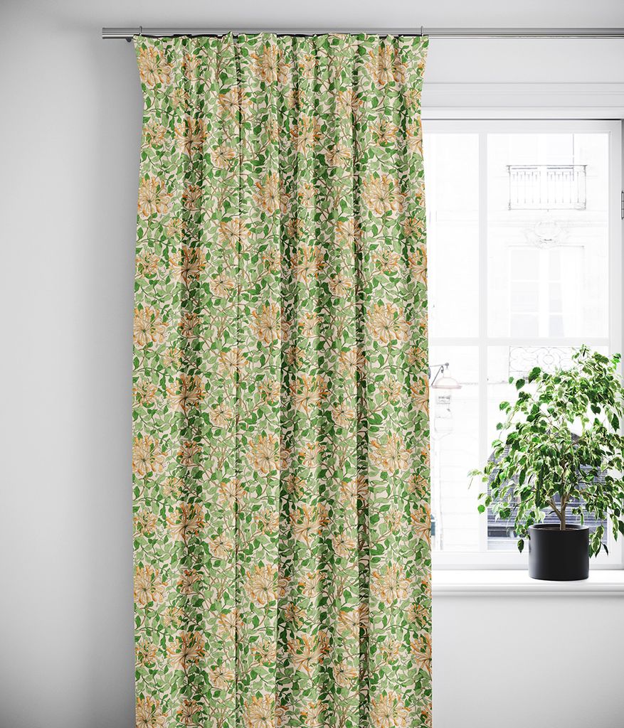 Honeysuckle aprikos gardiner har ett slingrande blommönster i grönt och aprikos på ljus botten. De är sydda i 100 % bomull med Oeko-Tex-certifiering och ger rummet ett levande men behagligt uttryck.