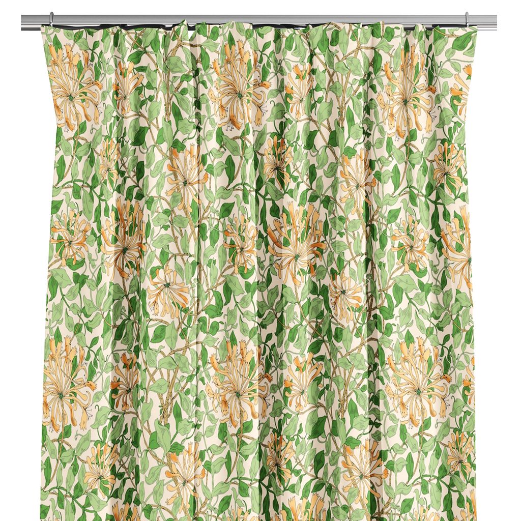 Honeysuckle aprikos gardiner är ett harmoniskt och botaniskt inslag i hemmet, inspirerat av kaprifolens slingrande form. Mönstret kombinerar aprikosfärgade blommor med mjukt grönskande bladverk mot en ljus, naturtonad bakgrund – ett uttryck som både lyfter rummet och skapar lugn.