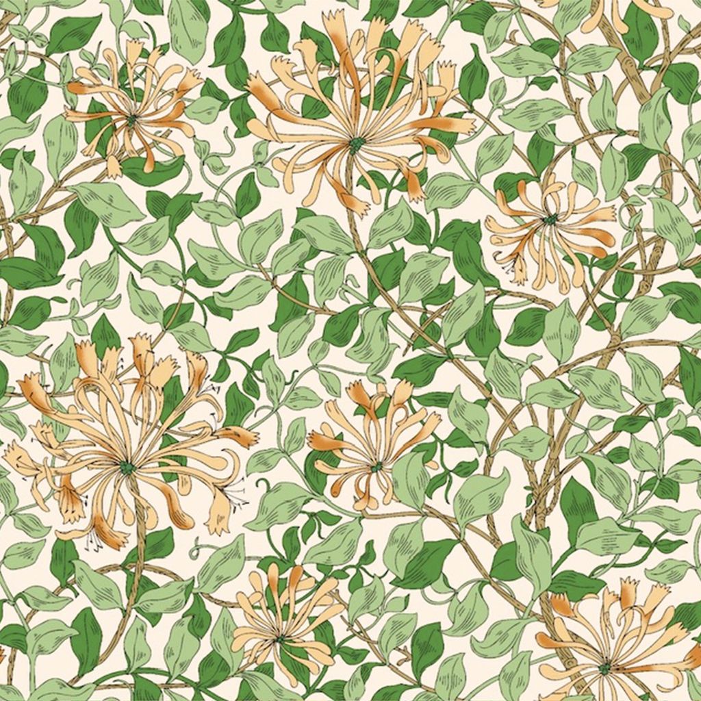 Honeysuckle aprikos är ett livfullt och samtidigt harmoniskt gardintyg med inspiration från kaprifolens slingrande växtlighet. Mönstret är rikt och detaljrikt, där grönskande blad klättrar över tygets yta tillsammans med aprikosfärgade blommor mot en ljus, varm botten.