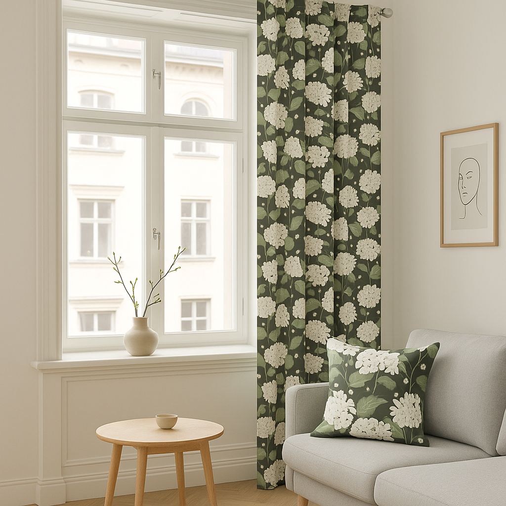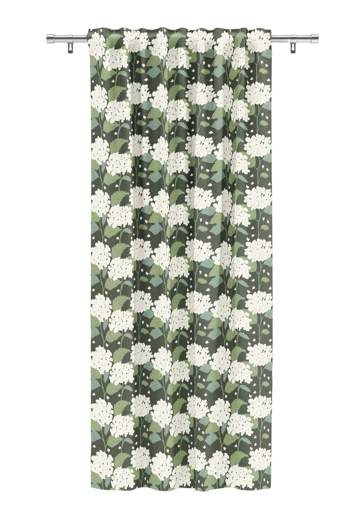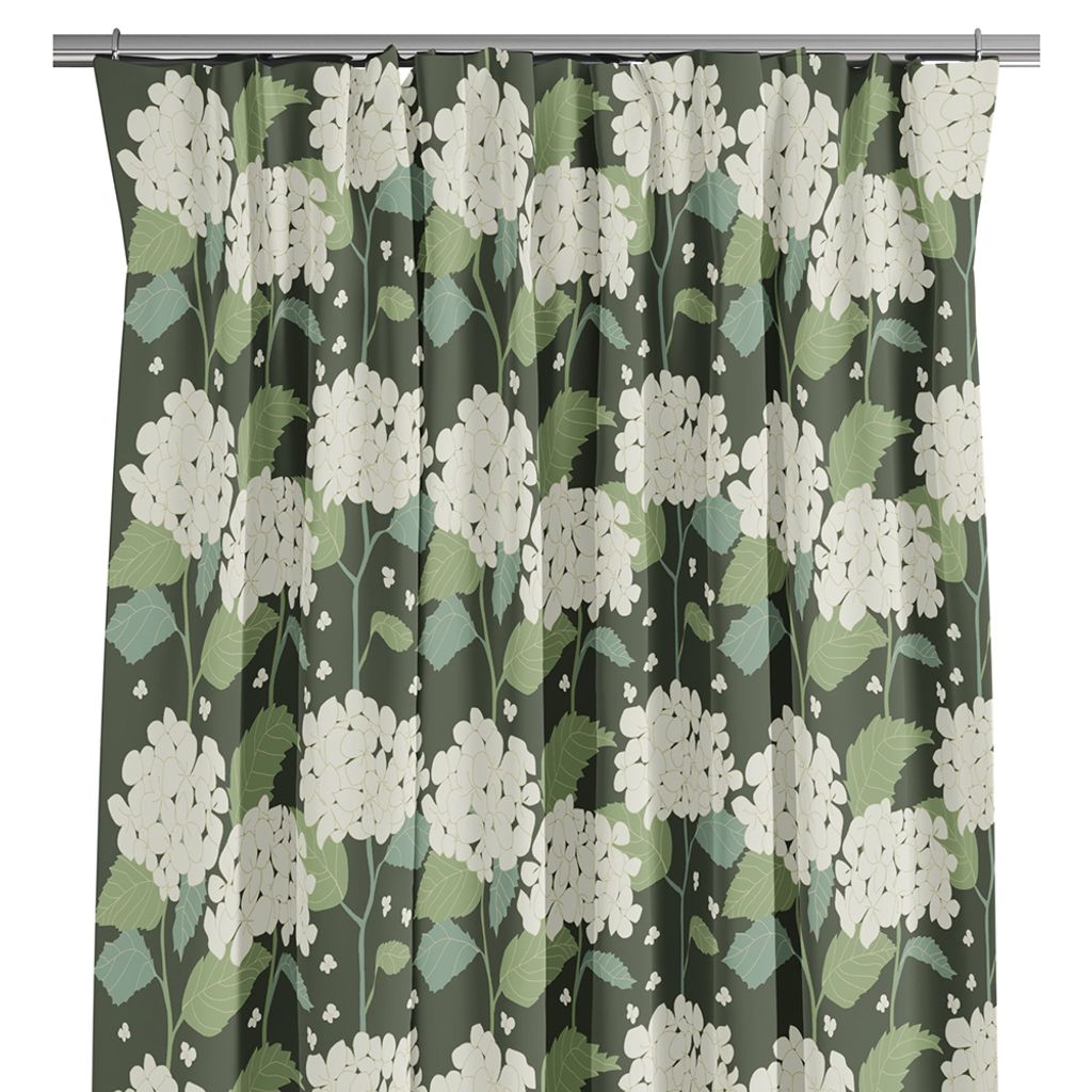 Hortensia grön är en hyllning till den klassiska svenska sommarens blomsterprakt. Gardinen pryds av stora, mjukt tecknade hortensiablommor i nyanser av vitt och creme, kompletterade med detaljrika blad i grönt och blågrått – allt mot en djupgrön bakgrund som skapar ett lugnt och harmoniskt uttryck.