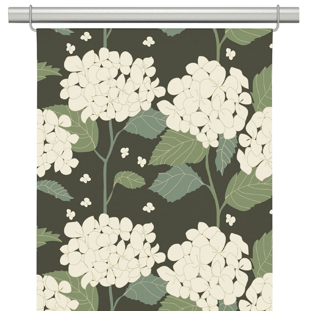 Hortensia grön panelgardin har ett elegant mönster av stora hortensiablommor i mjuka nyanser mot en djupt grön botten. En tidlös design som för in naturens lugn och klassisk blomsterprakt i hemmet.
