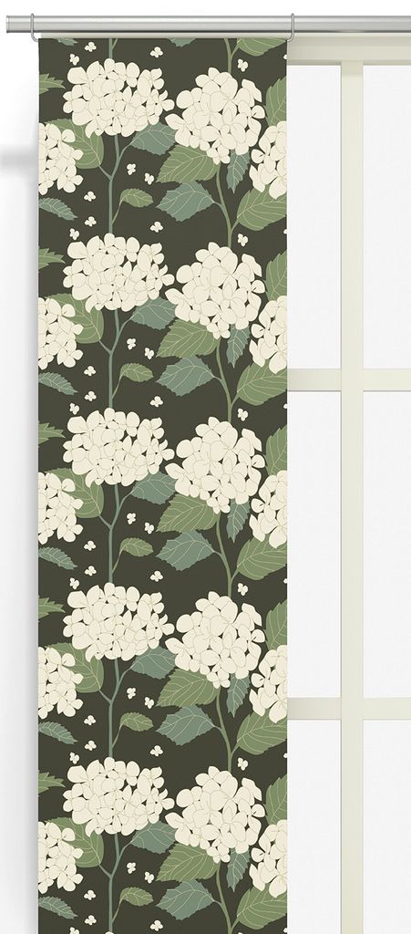Hortensia grön panelgardin är en vacker textil med inspiration från sommarens blomstrande trädgårdar. Mönstret visar stora, stiliserade hortensiablommor i ljusa krämvita toner med gröna blad mot en mörkgrön bakgrund. Den dova färgskalan skapar en harmonisk kontrast som ger rummet en elegant och rofylld atmosfär.