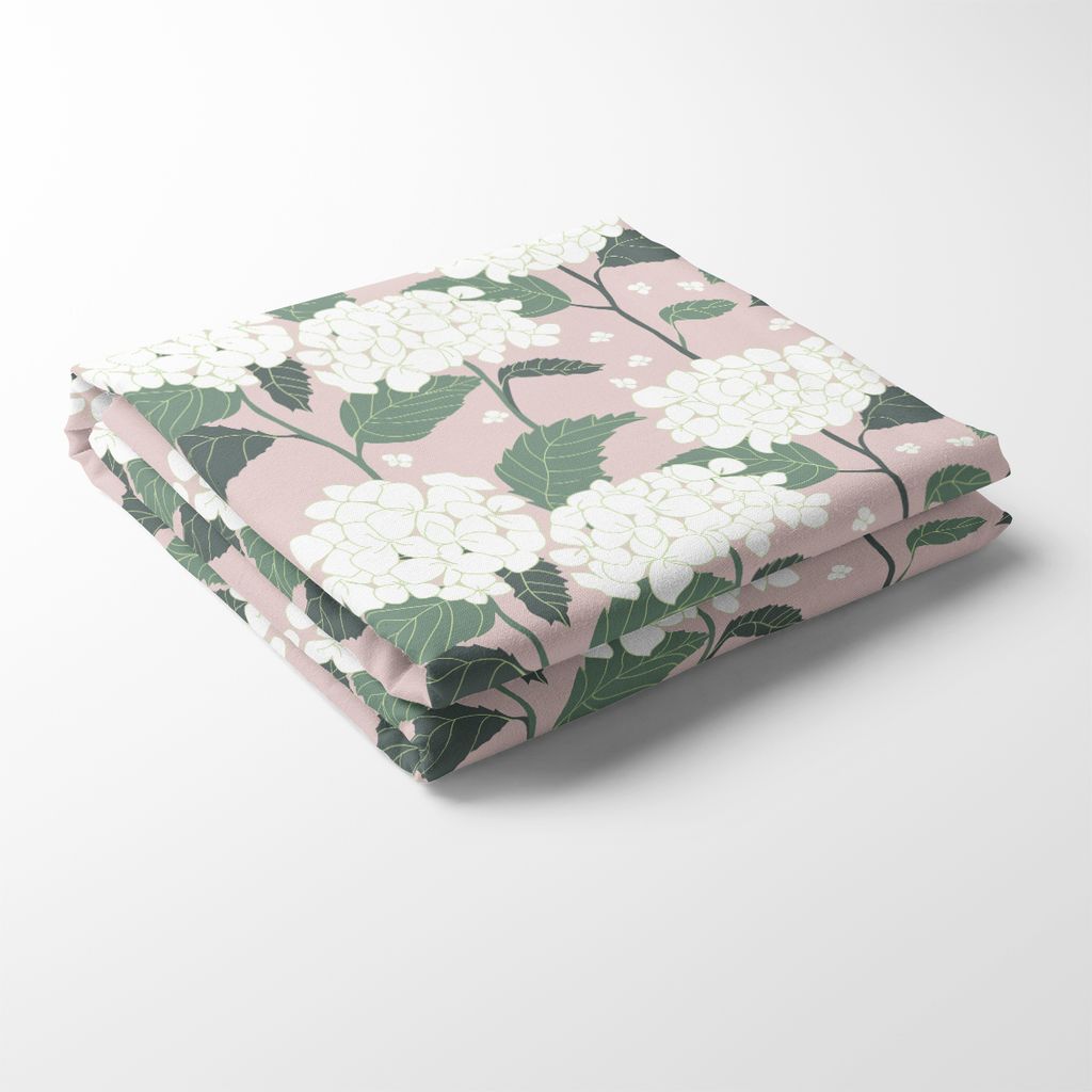 Hortensia rosa bordsduk har ett mjukt blomstermönster med vita hortensior och gröna blad mot en dämpad rosa botten. En bordsduk som ger dukningen ett ombonat och inbjudande uttryck. Duken finns i 4 olika storlekar.