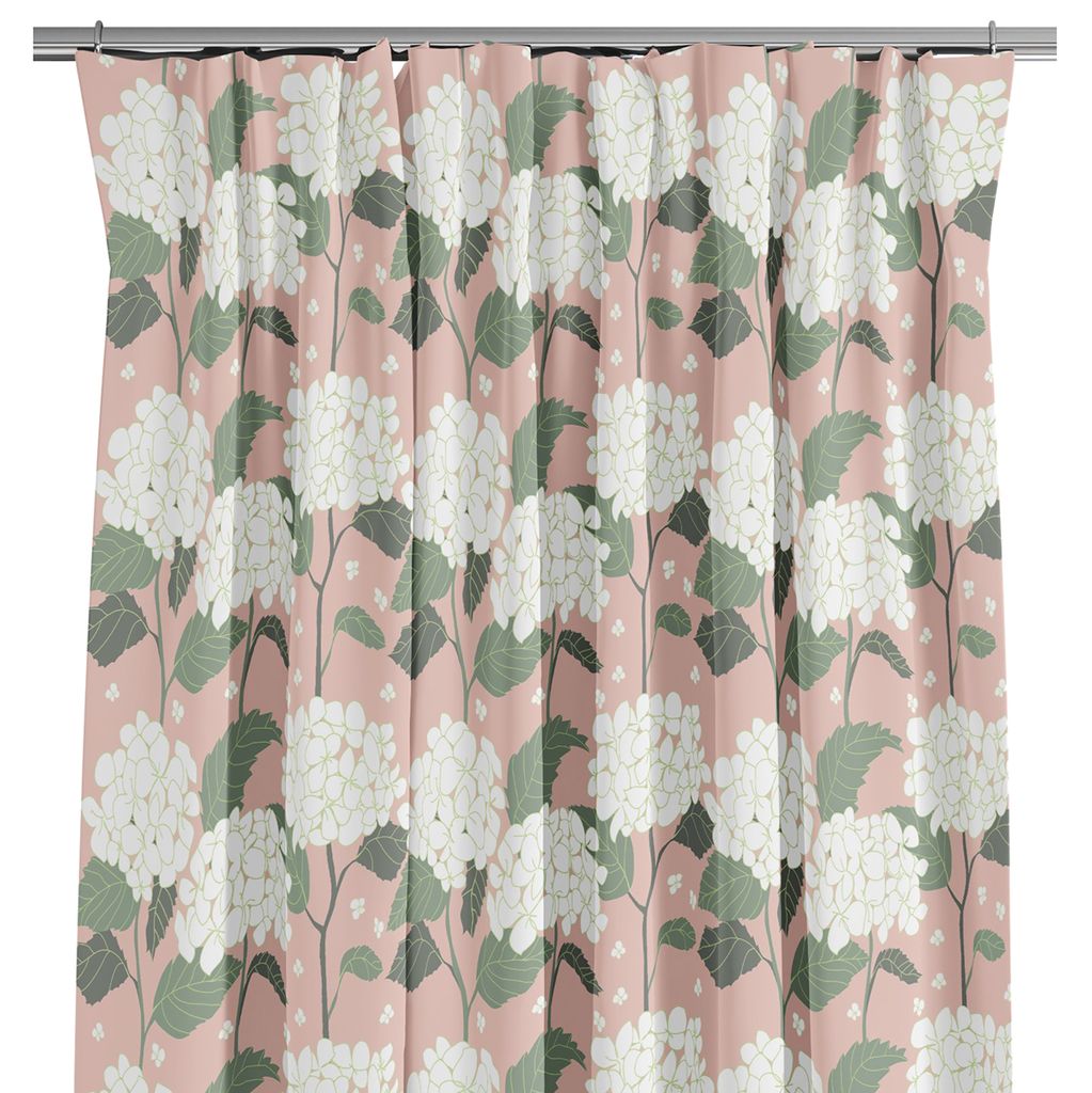 Hortensia rosa är gardiner som låter rummet blomma. Det täta mönstret av vita hortensiablommor i kombination med gröna blad skapar ett levande men harmoniskt uttryck. Den rosa bakgrunden ger en varm och inbjudande känsla som passar lika bra i vardagsrum som i sovrum eller kök.