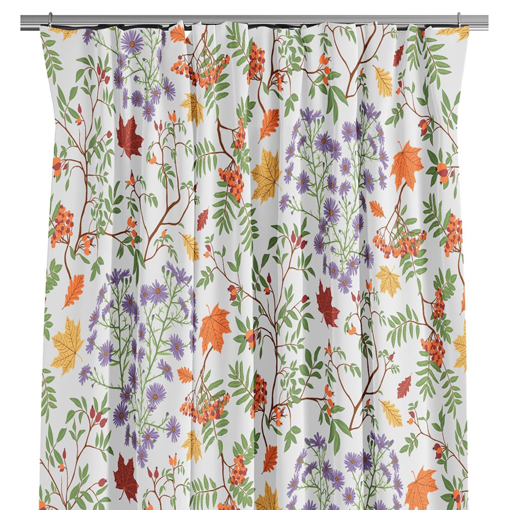 Skapa en varm och inbjudande känsla i ditt hem med Höstaster gardiner, ett textilval som fångar skönheten i den svenska höstens flora. Mönstret är rikt och illustrativt, med inslag av rönnbärskvistar, höstlöv i röda, orangea och gula toner, samt lila höstastrar – allt mot en klar vit bakgrund som gör att färgerna verkligen får ta plats.