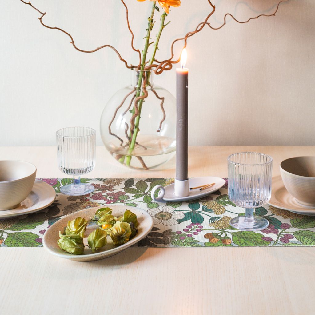 Härlig höstinspirerad bordslömare med blomstermönster, skapad i hållbart ekologiskt material och med svensk kvalitet – allt GOTS-certifierat.