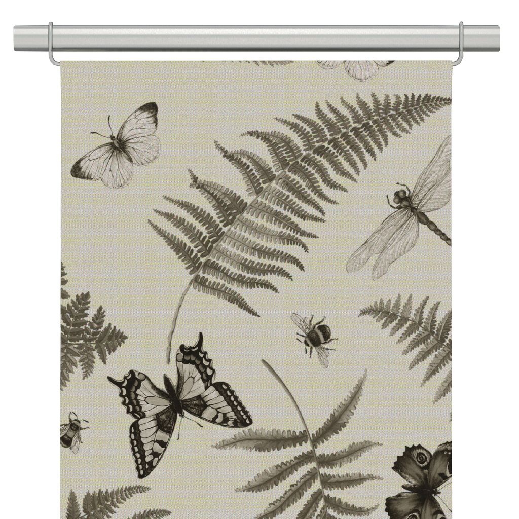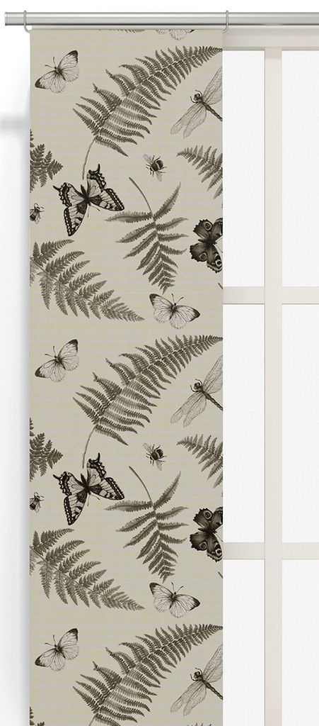 Humlan beige panelgardiner erbjuder ett naturnära och stilrent uttryck med en linnefärgad botten. Dessa panelgardiner pryds av vackra illustrationer av fjärilar, humlor och ormbunksblad, vilket ger en harmonisk känsla och en rustik touch till ditt hem.