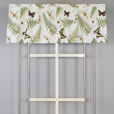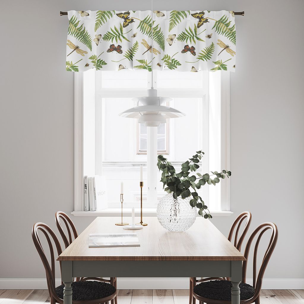 En gardinkappa med ett underbart mönster med humlor, trollslända och ormbunkar