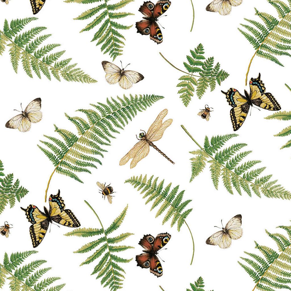 Offwhite botten och mönster med ormbunkar, fjärilar och humlor