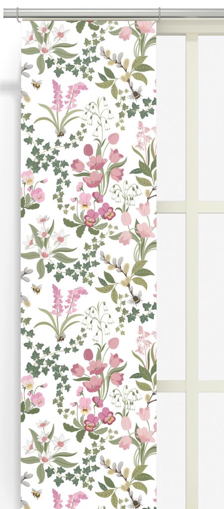 Humlegården panelgardiner kombinerar ett livfullt botaniskt mönster med harmoniska färgtoner i grönt, beige och puderrosa. En vacker gardin som ger rummet ett ljust och naturligt uttryck. Ofållad nederkant med overlocksöm.