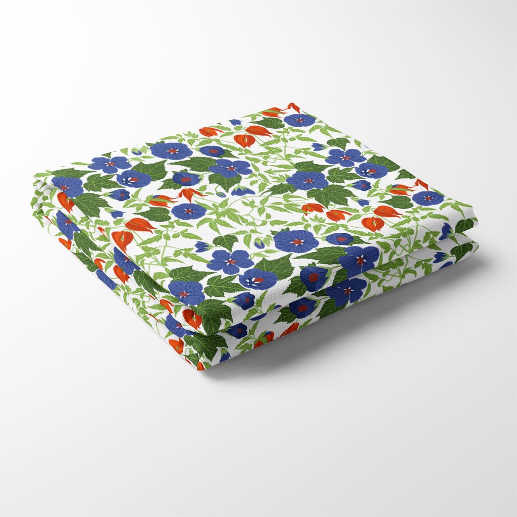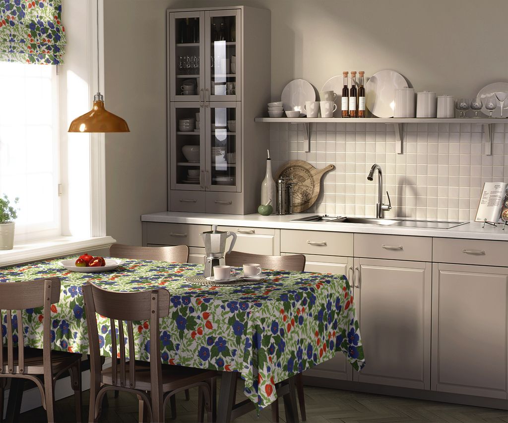 Husknuten blå bordsduk har ett livfullt blommönster med djupt blå blommor, röda frökapslar och gröna blad på ljus botten. En tidlös design som skapar en ombonad känsla i köket eller matsalen. Duken finns i 4 olika storlekar.