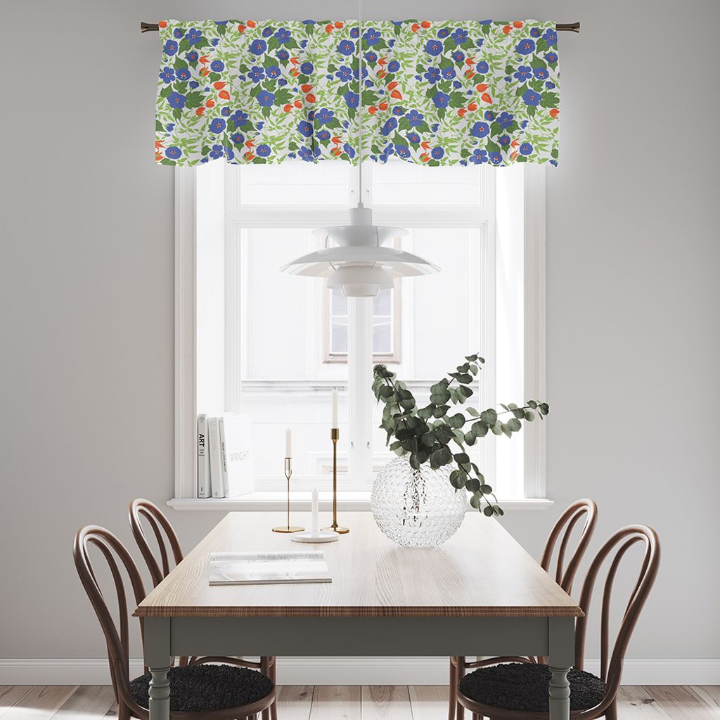 Med Husknuten blå gardinkappa får du en perfekt balans mellan lekfullhet och klassisk charm. Gardinkappan pryds av ett frodigt blommönster i friska blå toner, kompletterat av gröna blad och små röda detaljer som ger designen extra liv. Tyget fångar känslan av svenska sommarträdgårdar i full blom och passar lika bra i köket som i vardagsrummet.
