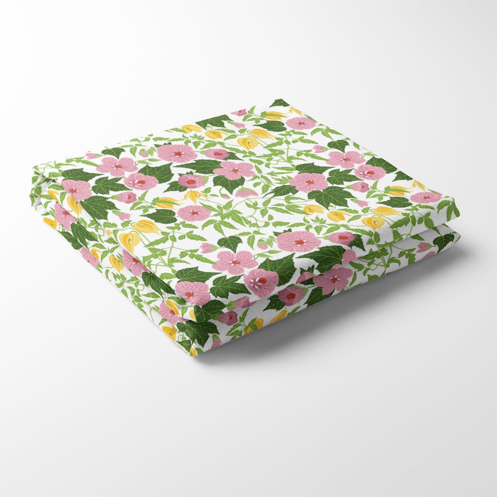 En blommig bordsduk med tätt mönster i rosa och gult på en vit botten. Husknuten rosa ger ditt bord en ljuvlig och inbjudande känsla. Duken finns i 4 olika storlekar.