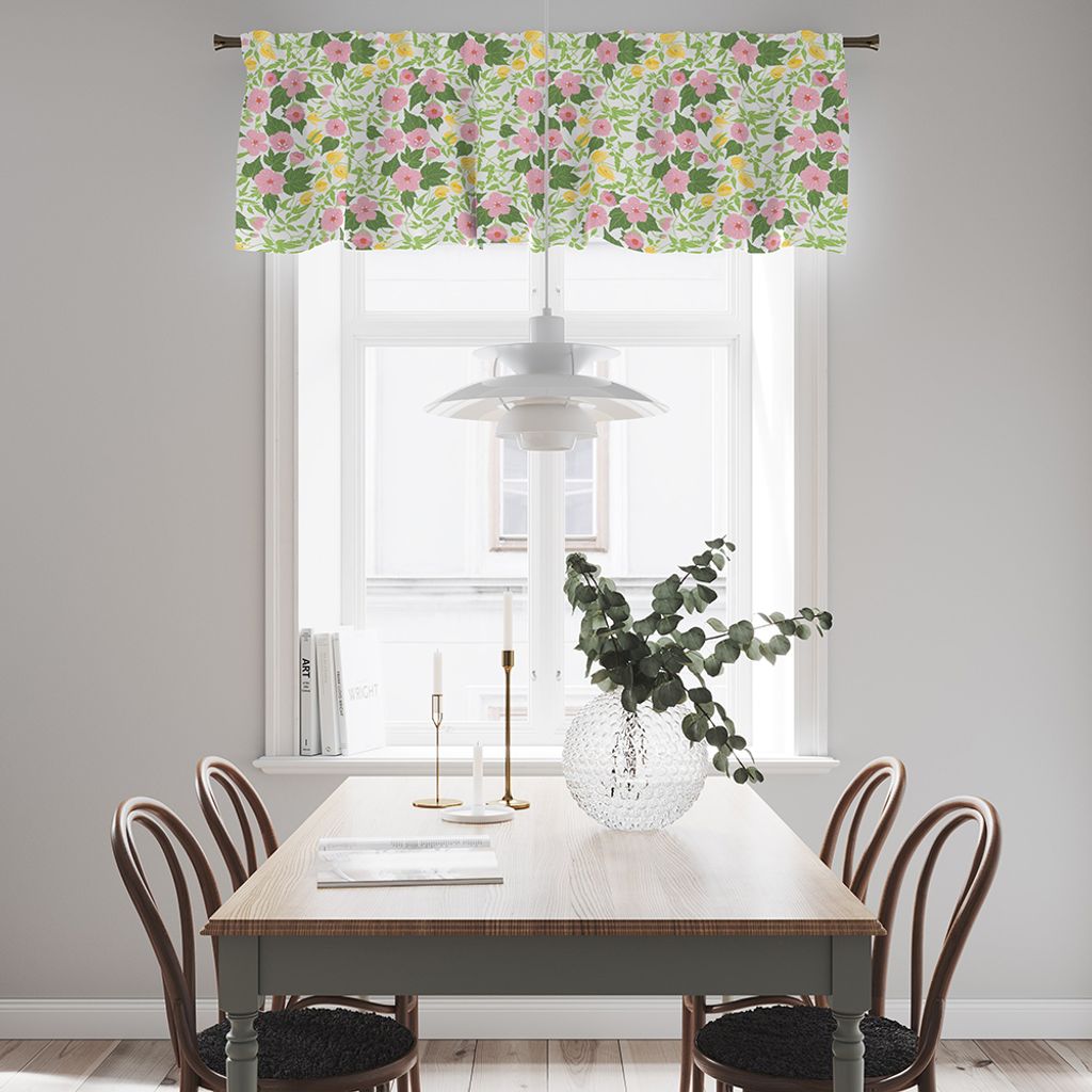 Husknuten rosa gardinkappa har en perfekt balans mellan lekfullhet och klassisk charm. Gardinkappan pryds av ett frodigt blommönster i rosa toner, kompletterat av gröna blad och små gula detaljer som ger designen extra liv. Tyget fångar känslan av svenska sommarträdgårdar i full blom och passar lika bra i köket som i vardagsrummet.