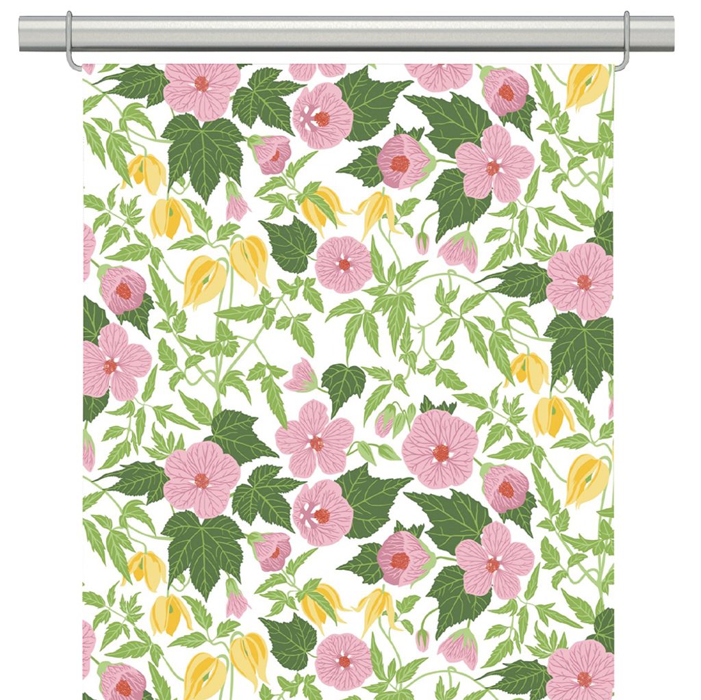 Det vackra mönstret av rosa blommor, gula knoppar och frodiga gröna blad ger en livfull och harmonisk atmosfär.