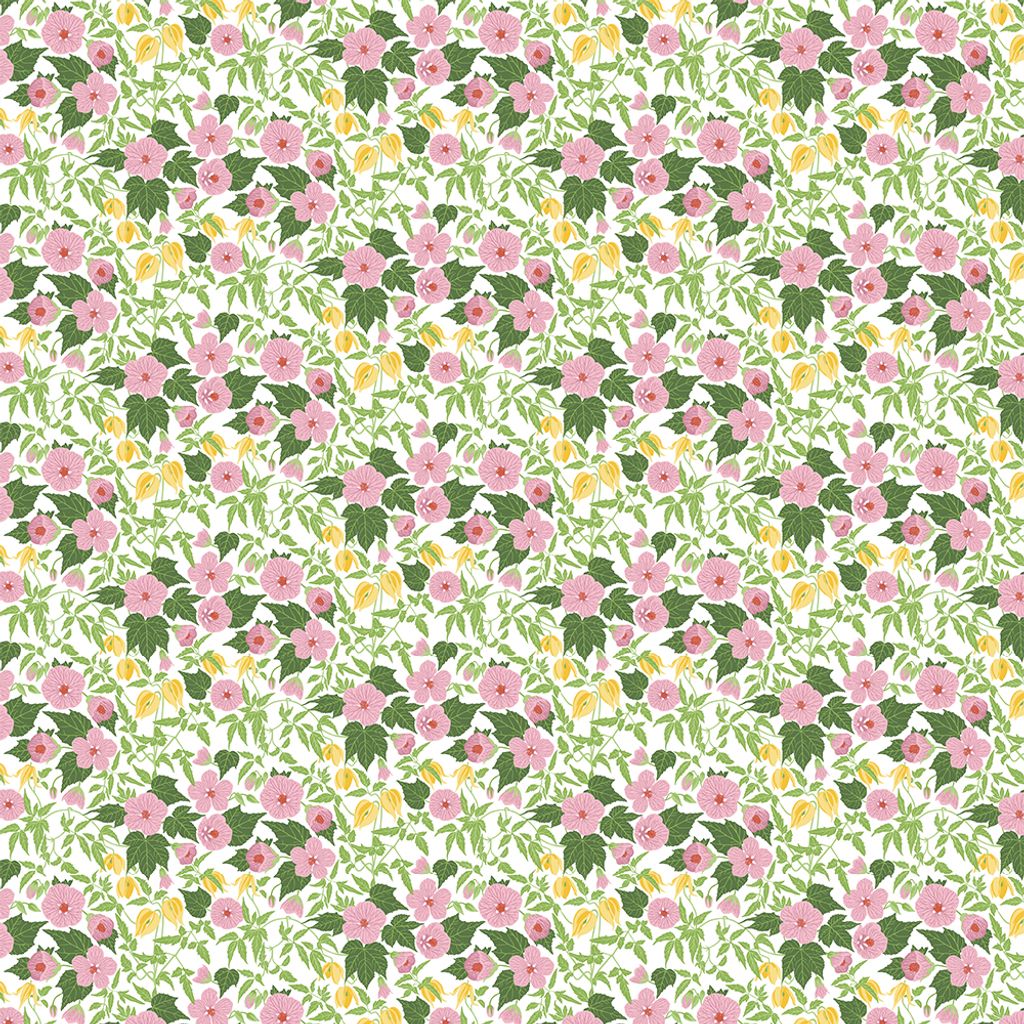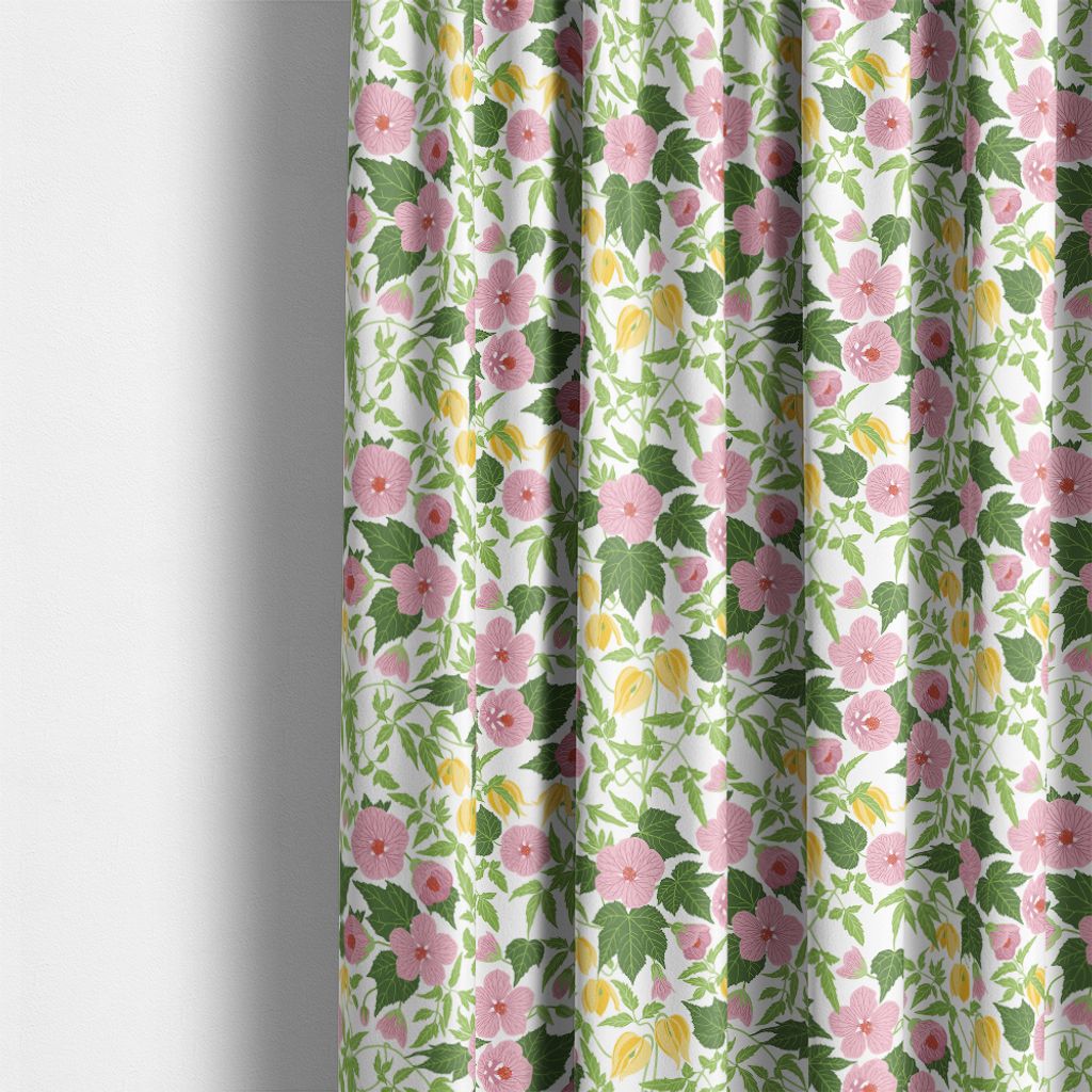 Husknuten rosa är ett livfullt tyg där romantiska rosa blommor möter solgula inslag och frodig grönska. Perfekt för gardiner, dukar och textila detaljer i hemmet.