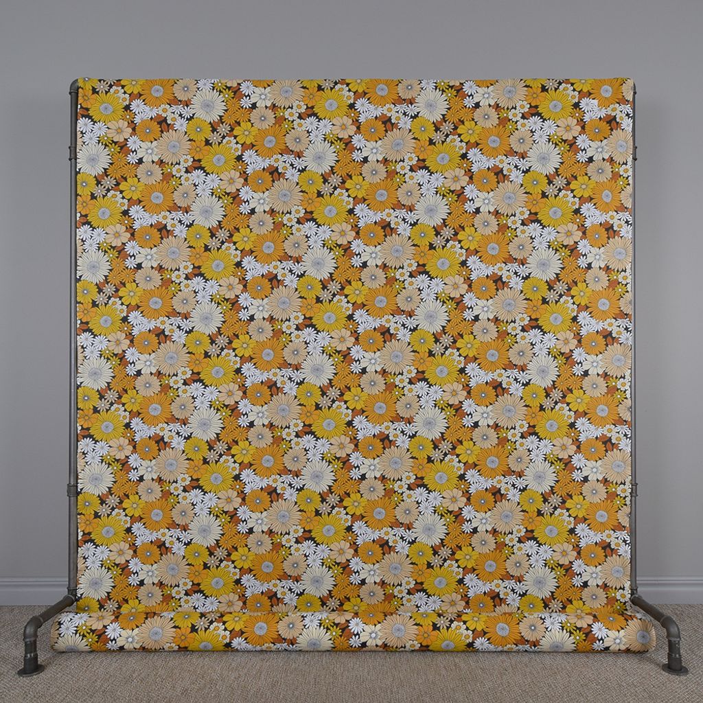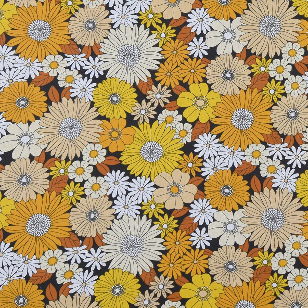 Ibiza gul blommigt bomullstyg är ett härligt retroinspirerat tyg med ett färgsprakande blommönster i varma gula, bruna och vita toner. Detta 100% bomullstyg har en poplinliknande känsla och är mångsidigt nog att användas för allt från sommarkläder och väskor till kuddar och små gardiner. Med sitt glada 70-talsinspirerade mönster är Ibiza gul ett utmärkt val för hobbyprojekt och kreativa sömnadsarbeten. Lätt att arbeta med och perfekt för den som vill skapa något unikt och färgglatt!
