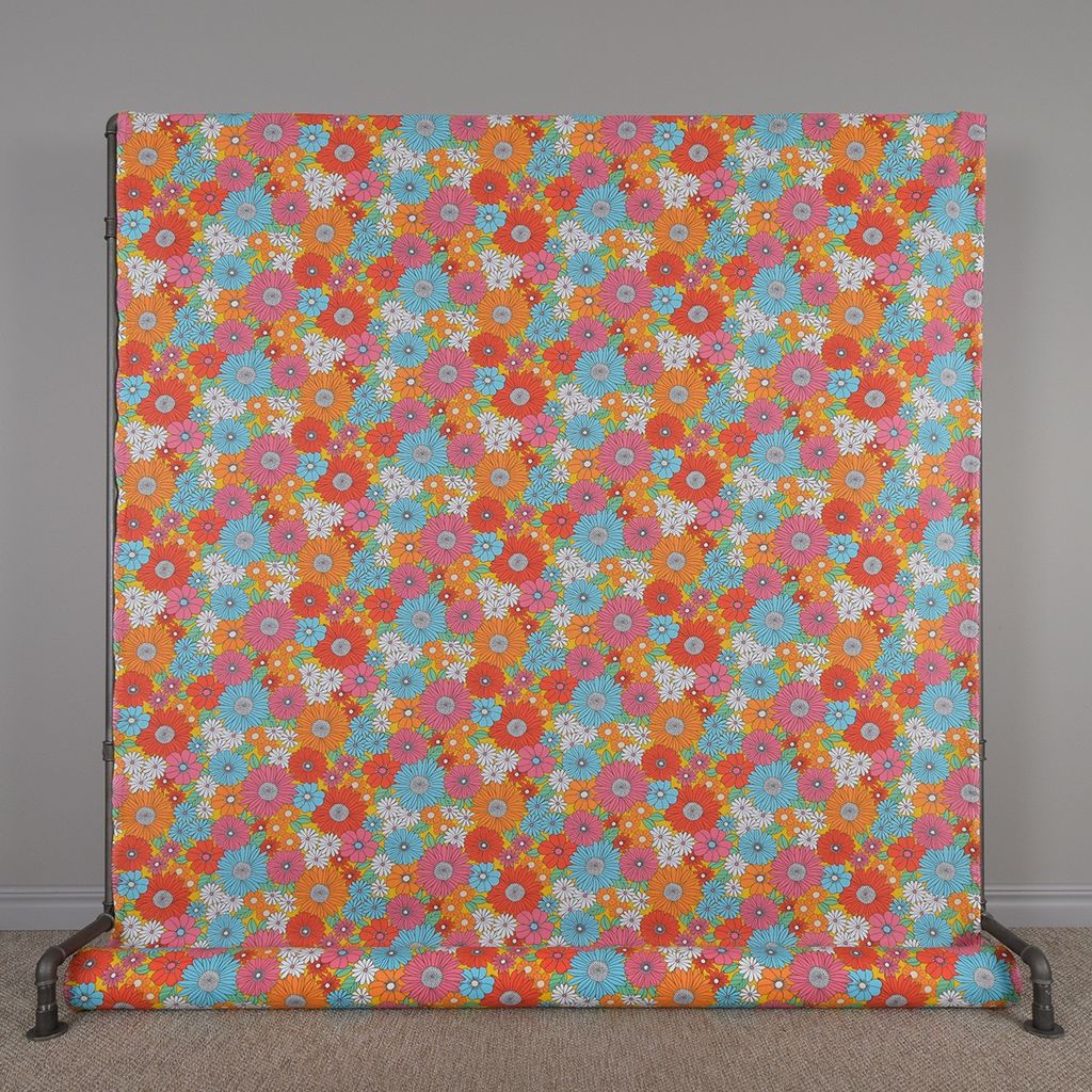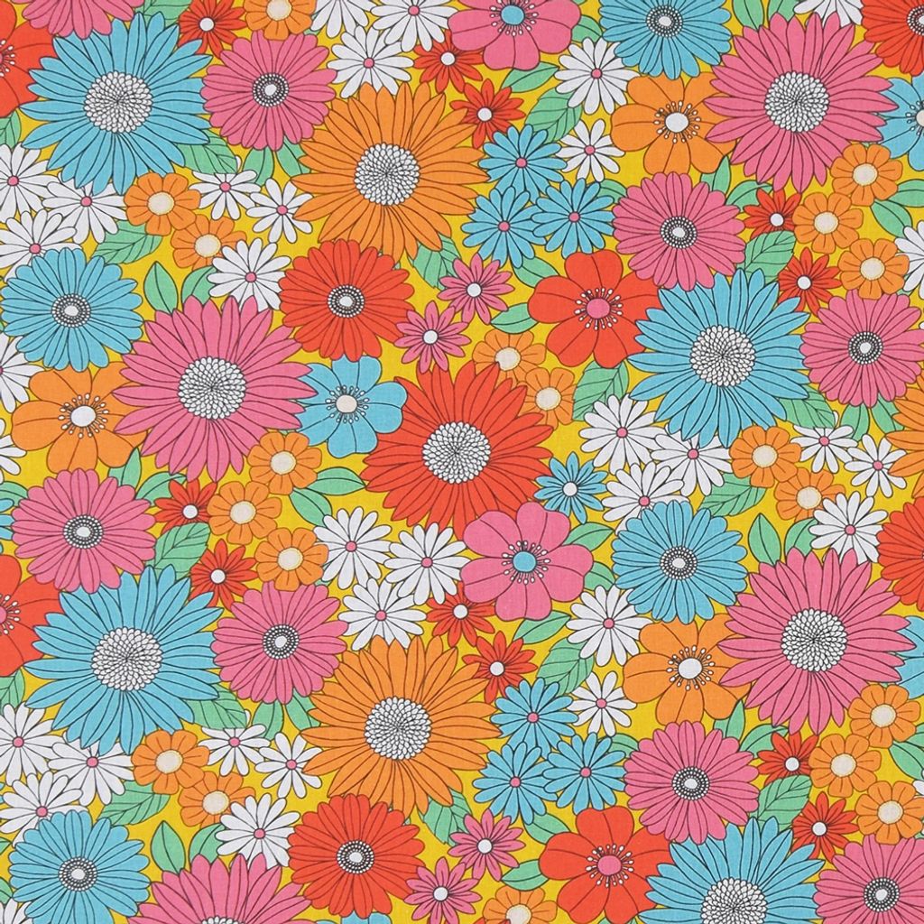 Ibiza multi – ett färgsprakande blommigt bomullstyg med ett retroinspirerat 70-talsmönster. Perfekt för kläder, kuddar, gardiner och kreativa projekt.