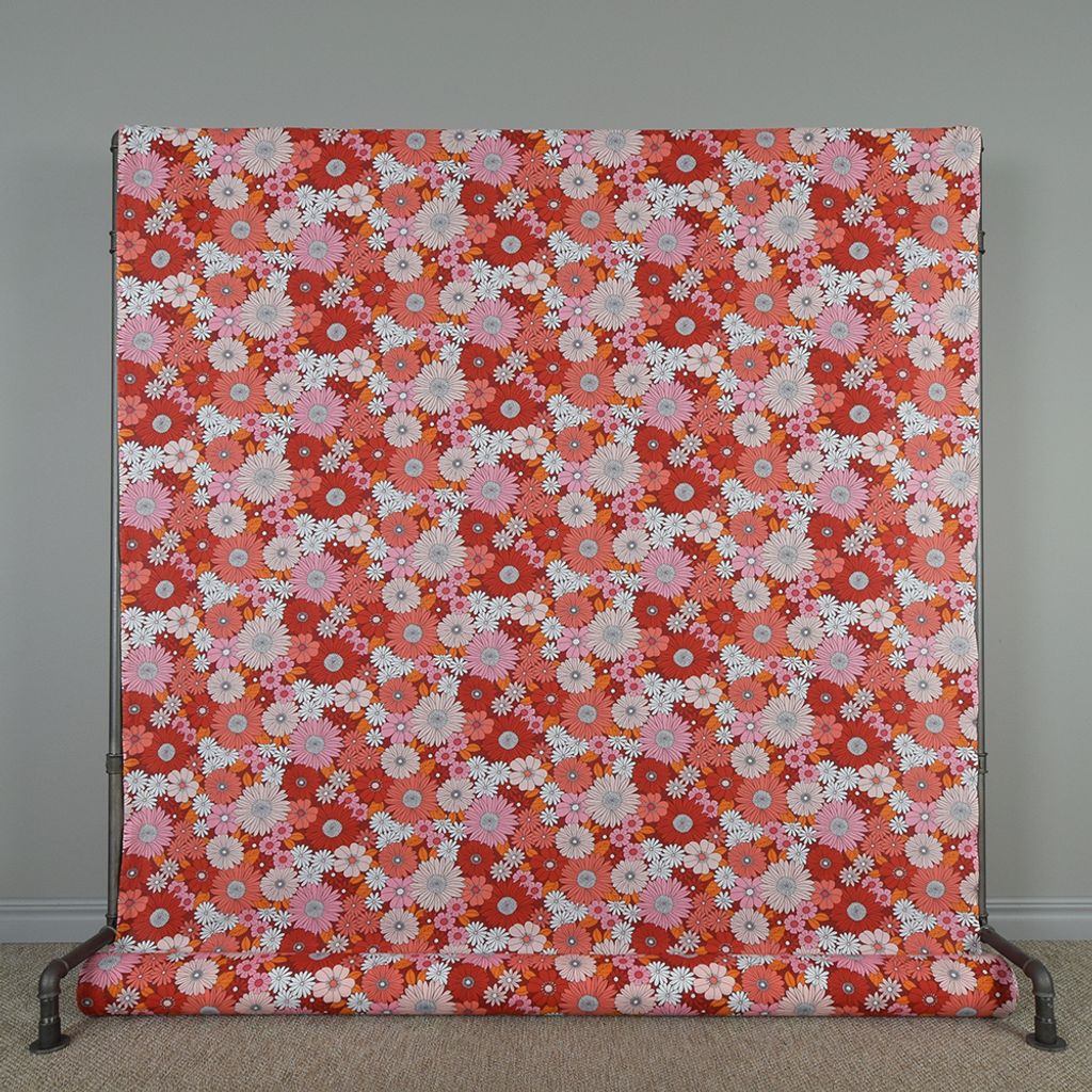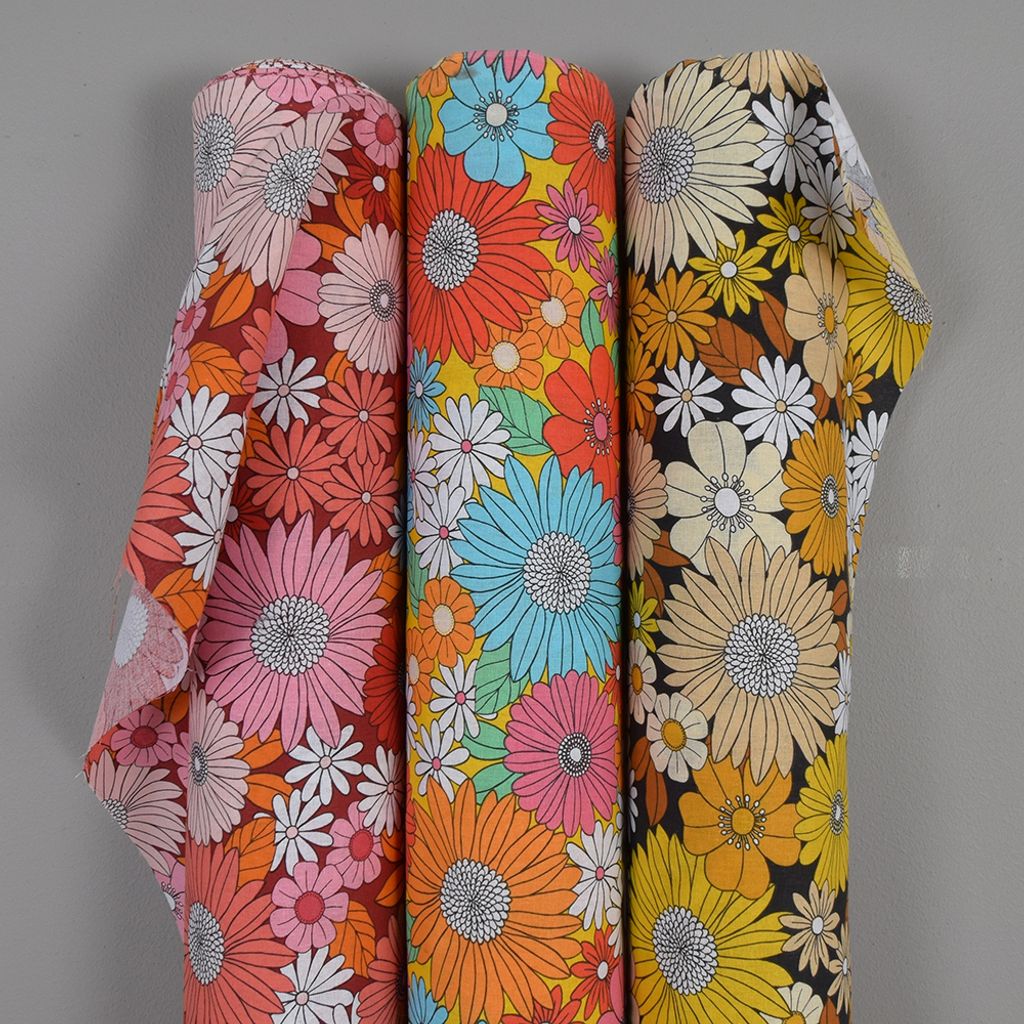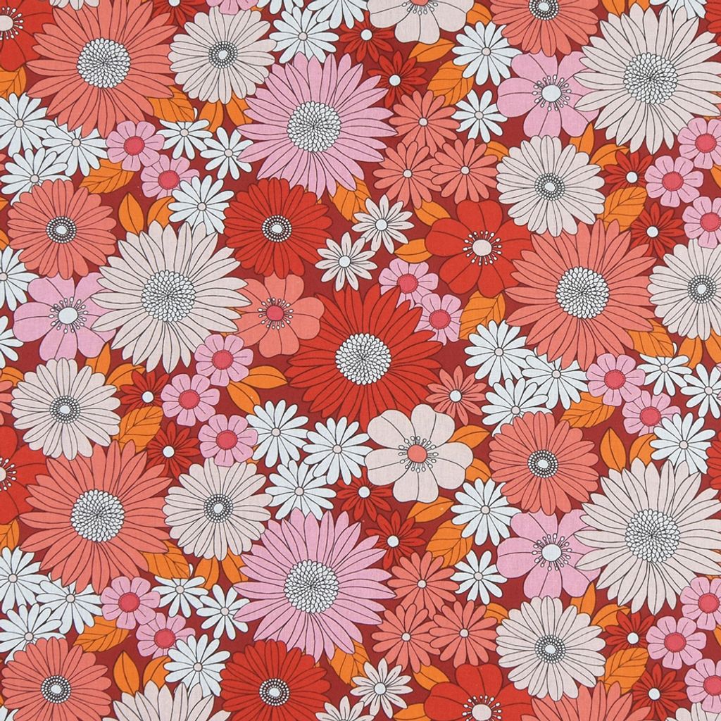 Ibiza röd – ett blommigt bomullstyg med ett retroinspirerat 70-talsmönster. Perfekt för kläder, kuddar, gardiner och kreativa projekt.