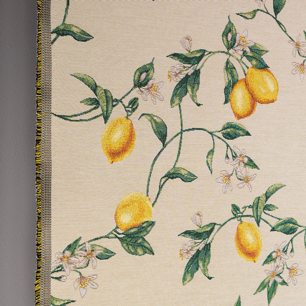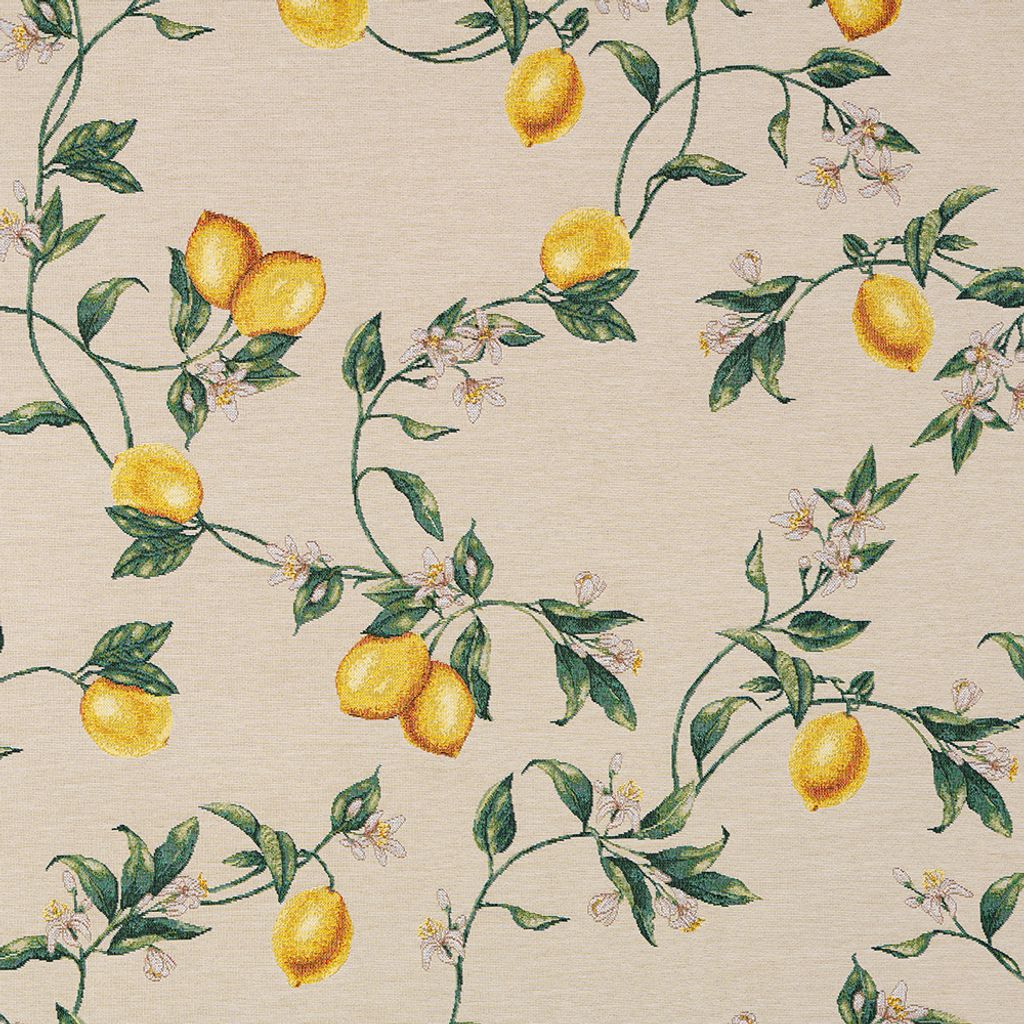 Irata gobeläng är ett elegant och lekfullt tyg som för tankarna till soliga citronlundar vid Medelhavet. Mönstret består av mogna gula citroner, gröna blad och små vita blommor som slingrar sig över en ljus botten – ett motiv som känns både fräscht, romantiskt och tidlöst.