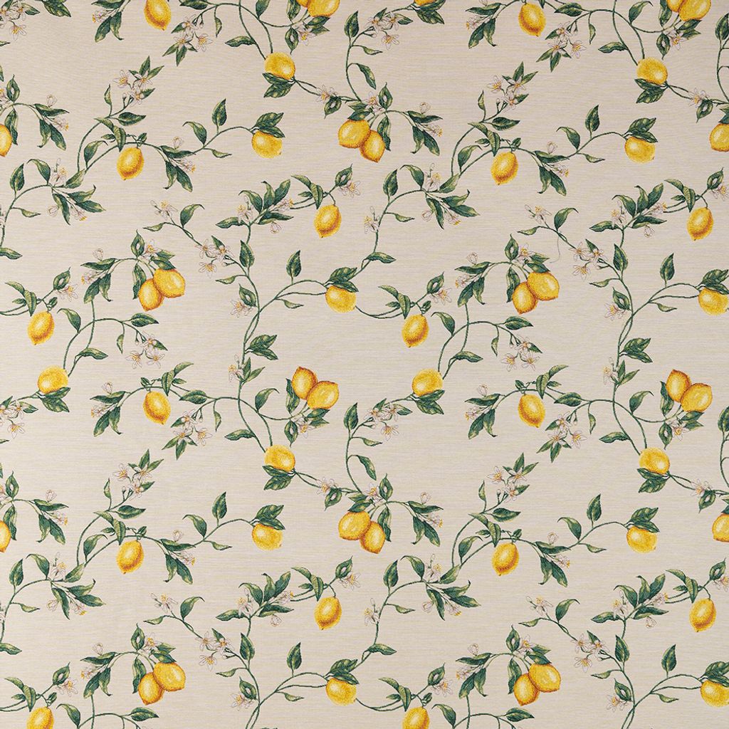 Irata gobeläng är ett ljust och somrigt möbeltyg med ett dekorativt citronmönster i grönt och gult. Ett fräscht val för dig som vill skapa en inredning med medelhavskänsla och livfull charm.