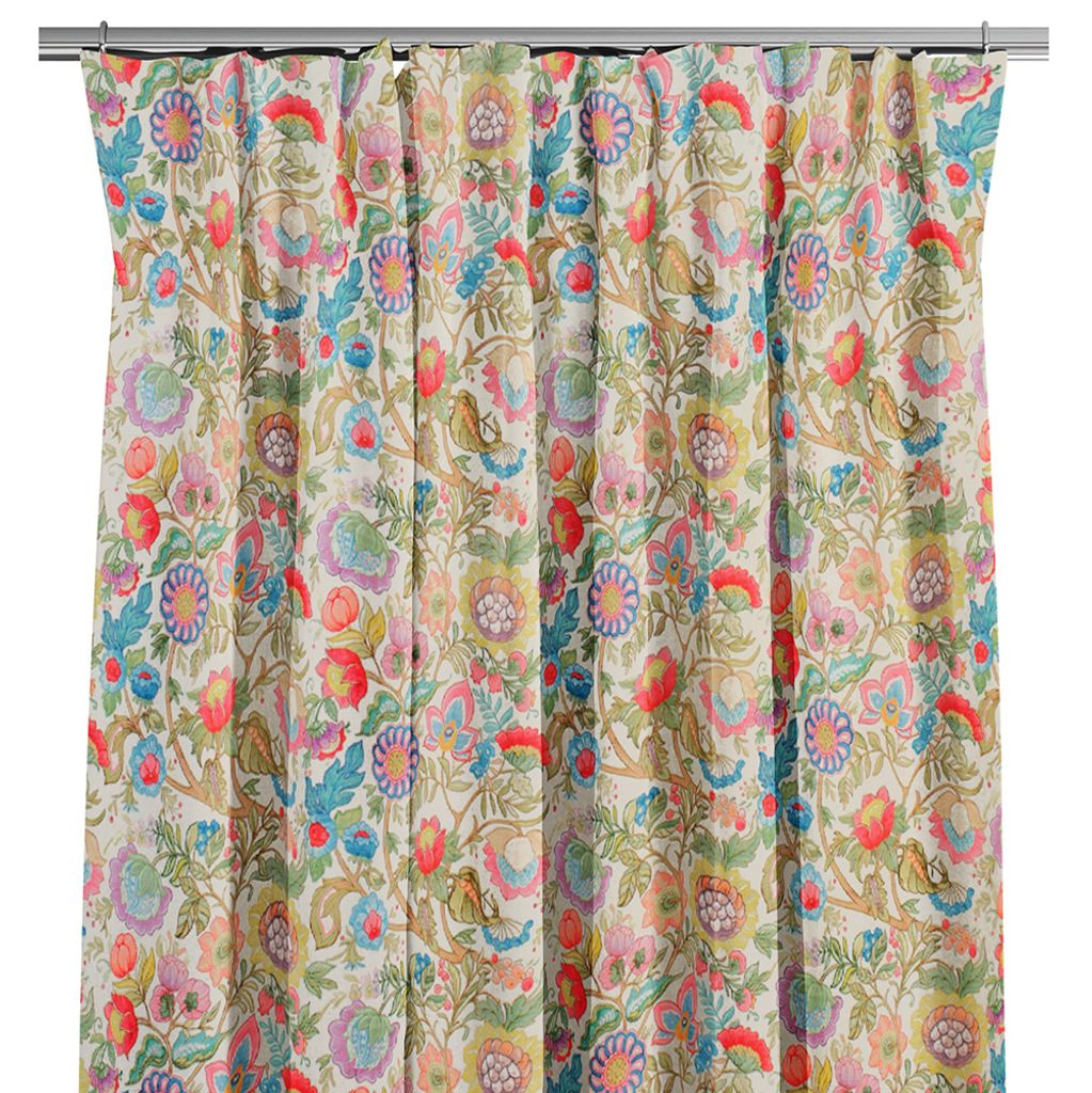 Färgstarka gardiner med ett färgsprakande mönster av blommor och blad i grönt, rosa och rött likt kurbits.