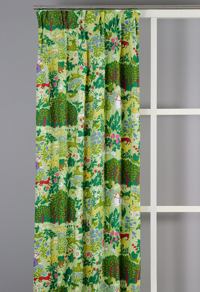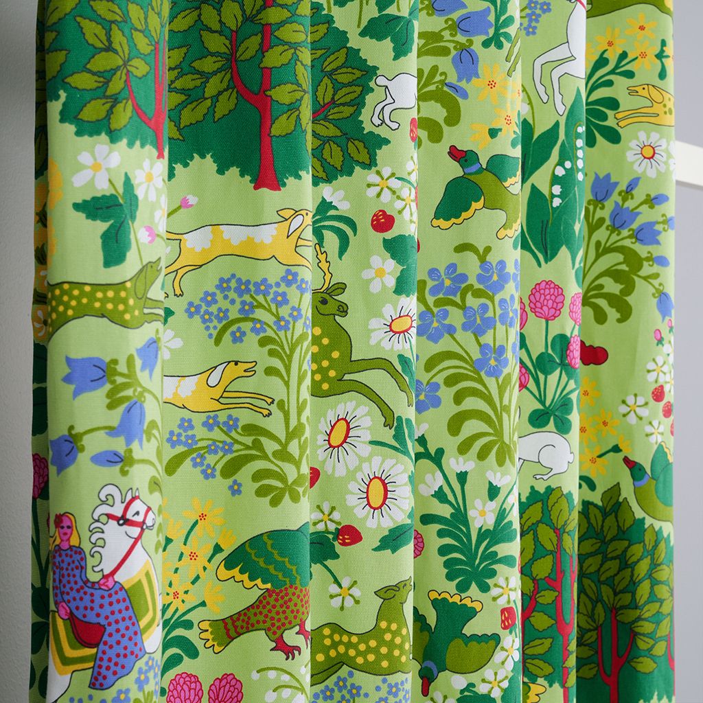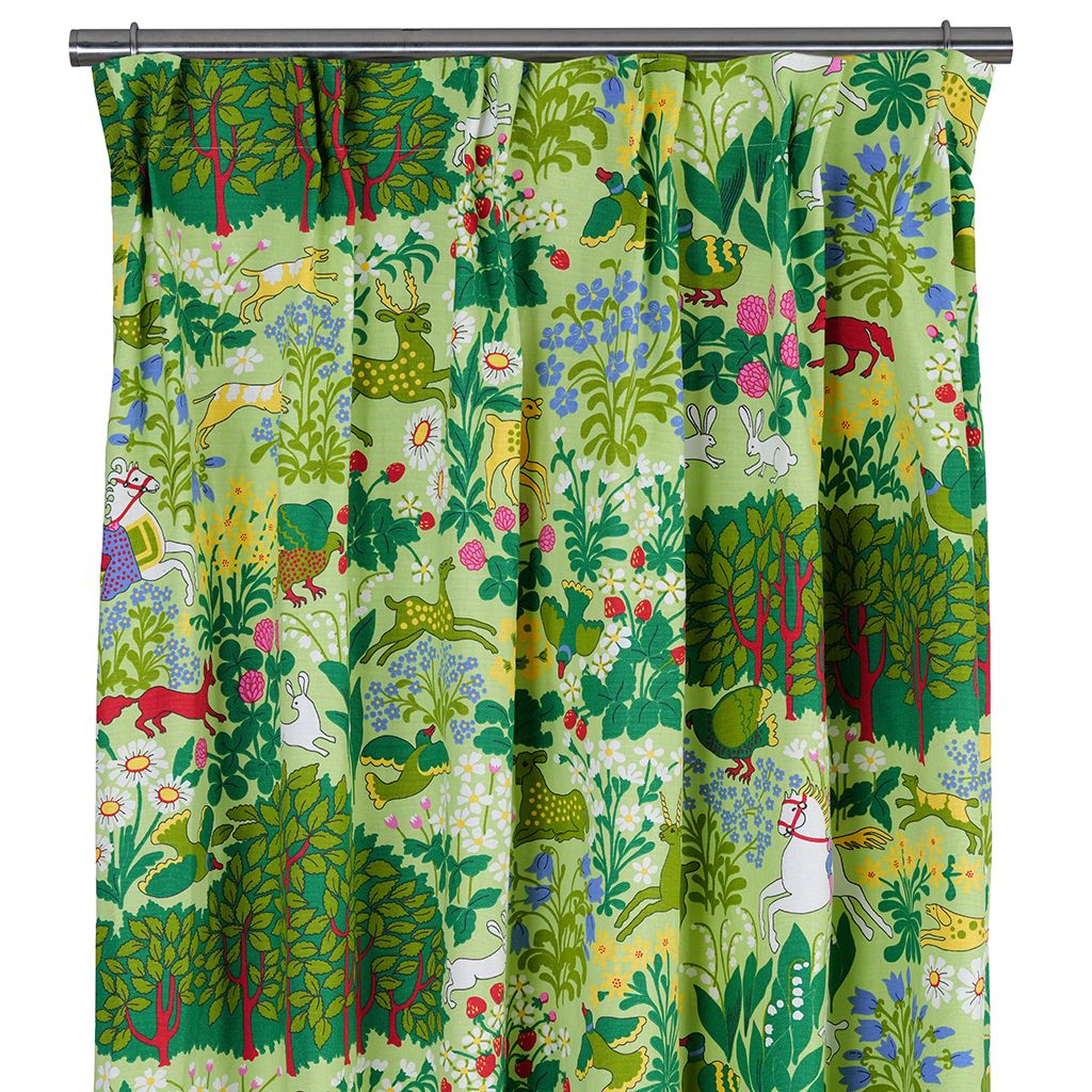Mot en mjuk ljusgrön botten breder ett myller av skogsscener ut sig. Här samsas hjortar, rävar, harar och fåglar bland blommande växter, bär och frodig grönska. Små berättande inslag – som ryttare till häst och lekfulla djur – ger gardinerna ett nästan sagolikt uttryck som väcker liv i rummet.