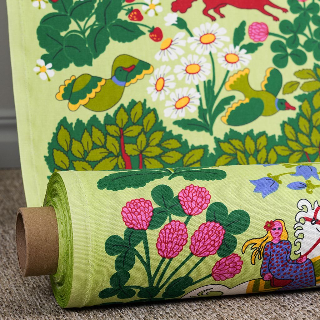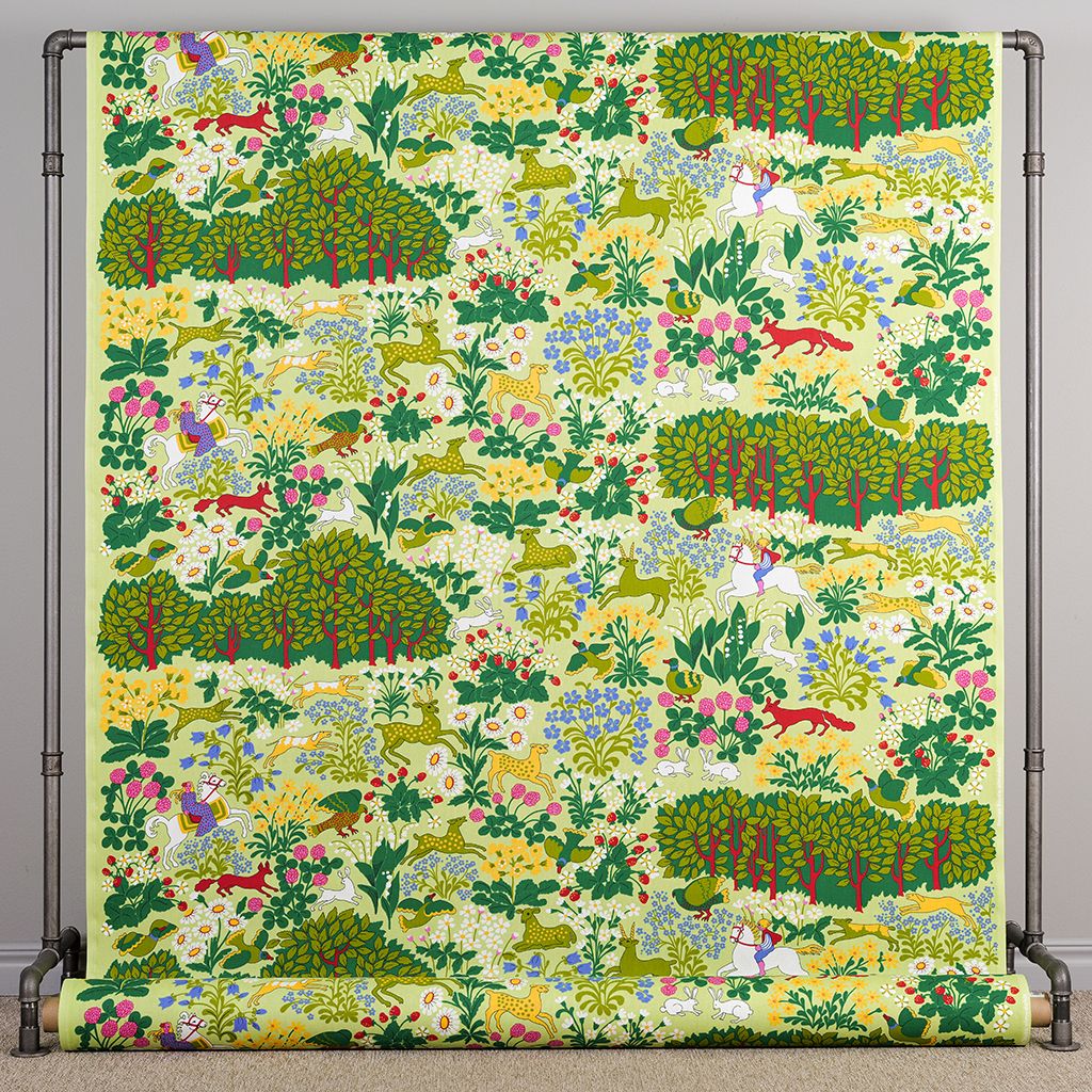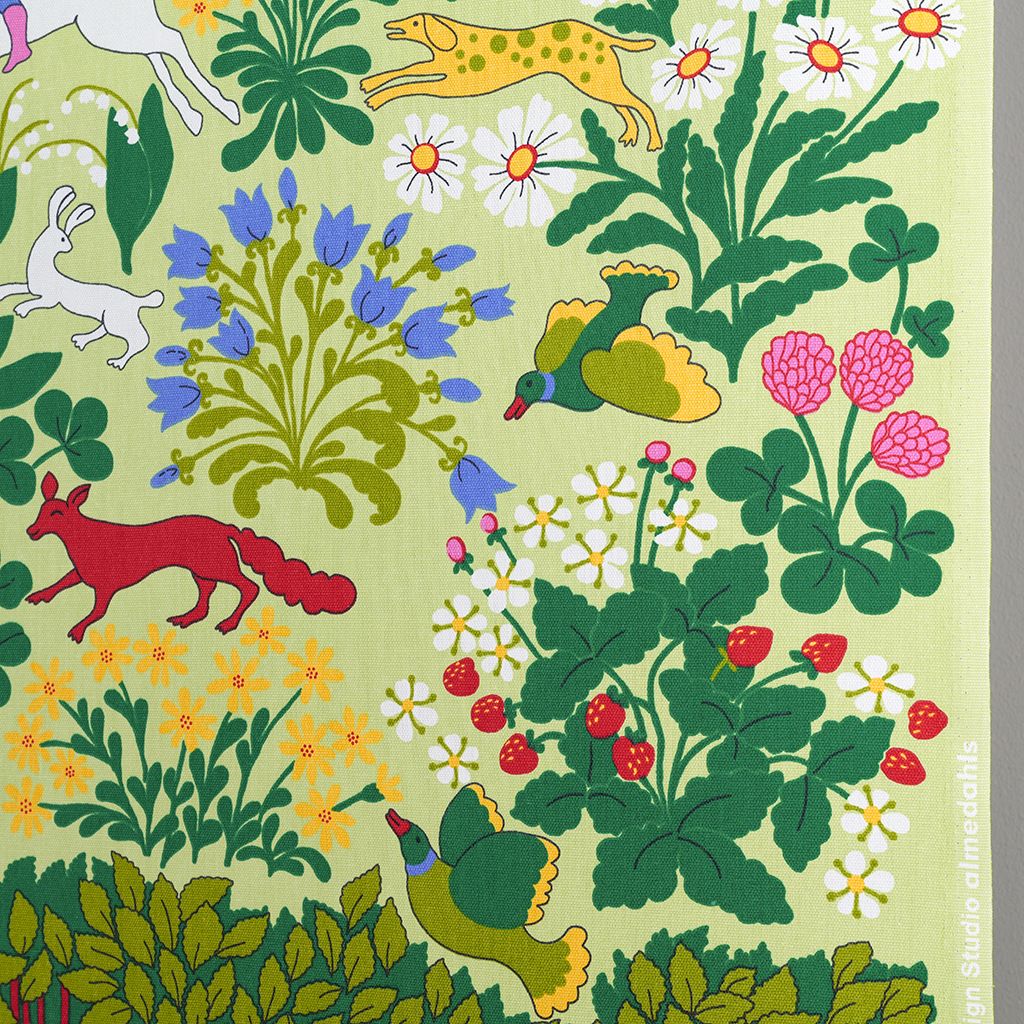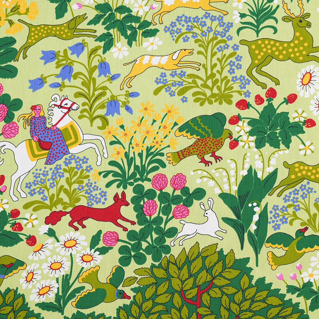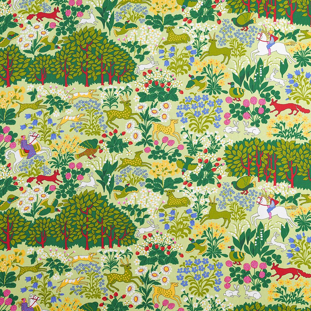 I mönstret syns hjortar, rävar, harar och fåglar som rör sig mellan täta träd, blomsterängar och bärbuskar. Små scener skapar en sagolik känsla – här finns även ryttare till häst och lekfulla inslag som ger tyget en unik karaktär. Färgskalan domineras av olika nyanser av grönt, kombinerat med inslag av gult, rött, blått och vitt som ger liv och kontrast.