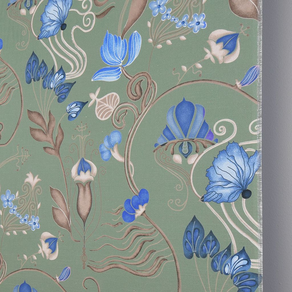 Ett härligt blommönster i blått, beige och brunt på en ljusgrön botten.