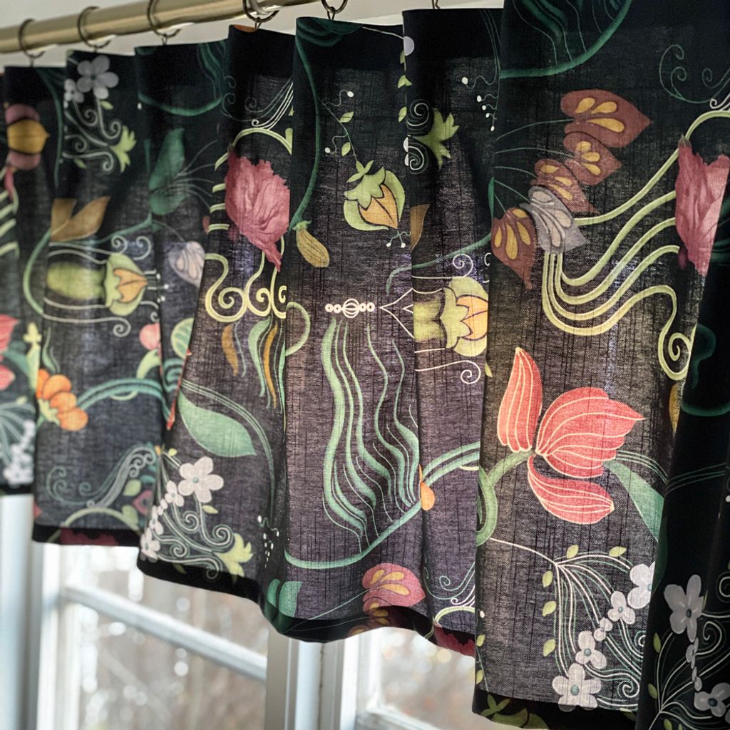 Gardinkappa där botten färgen är svart men drar något åt det mörkgröna hållet med vackra blommor och kurbits motiv i grönt, rosa och gult.