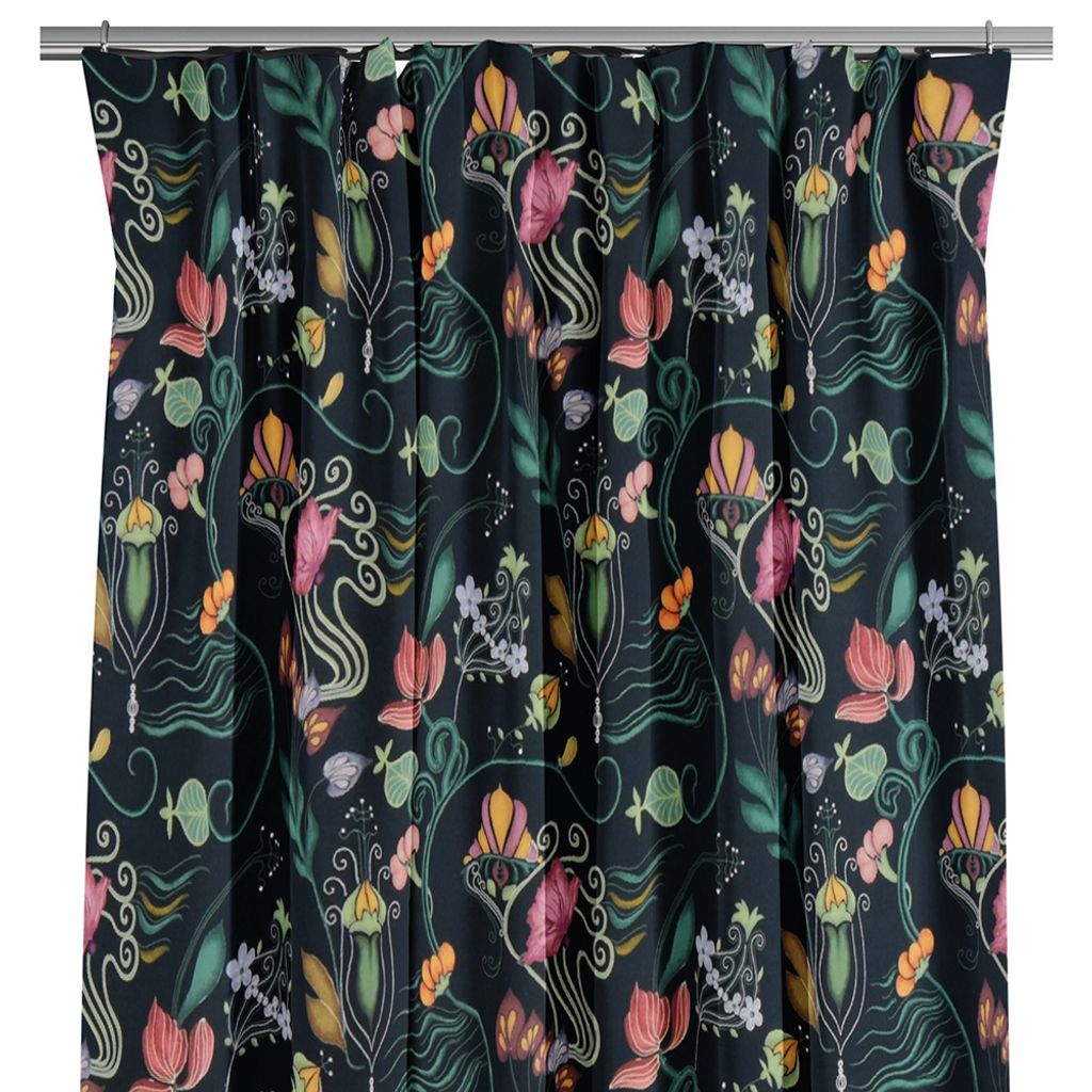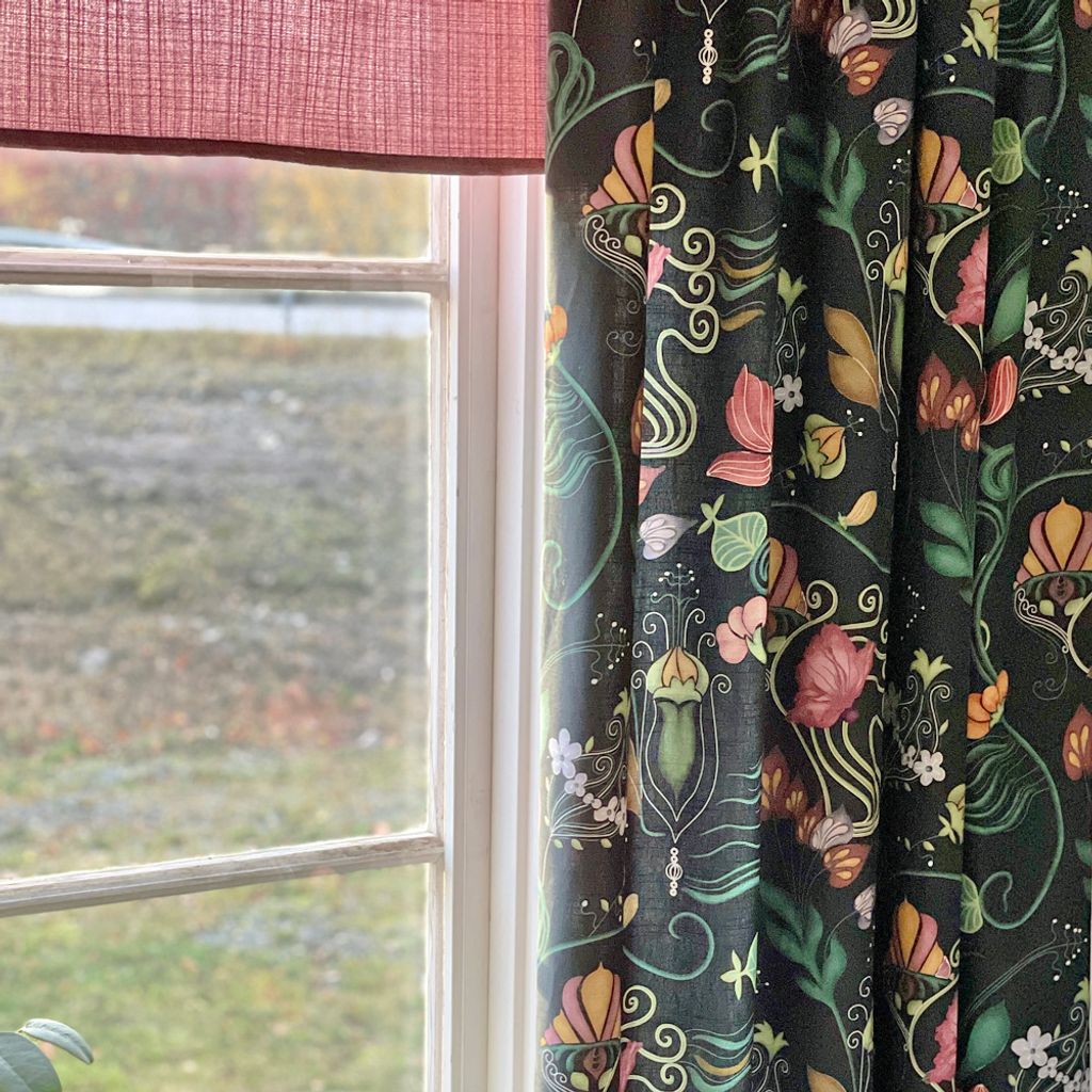 Gardiner där botten färgen är svart men drar något åt det mörkgröna hållet med vackra blommor och kurbits motiv i grönt, rosa och gult.