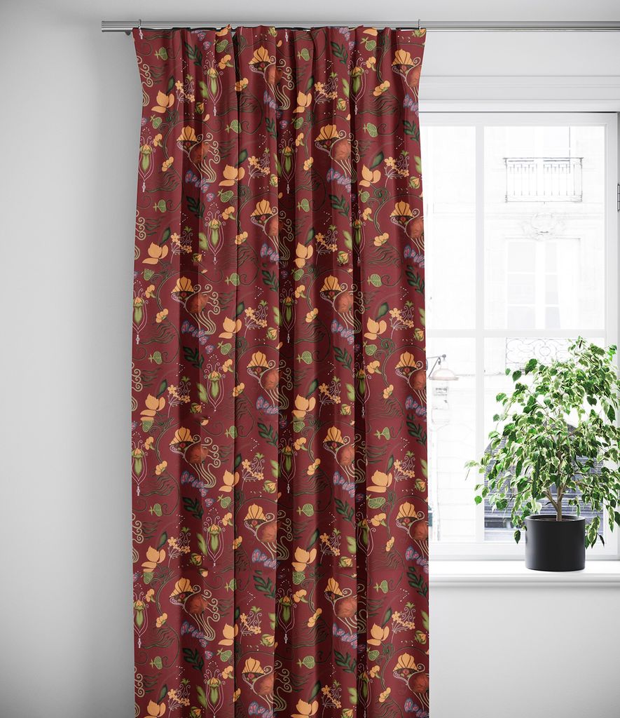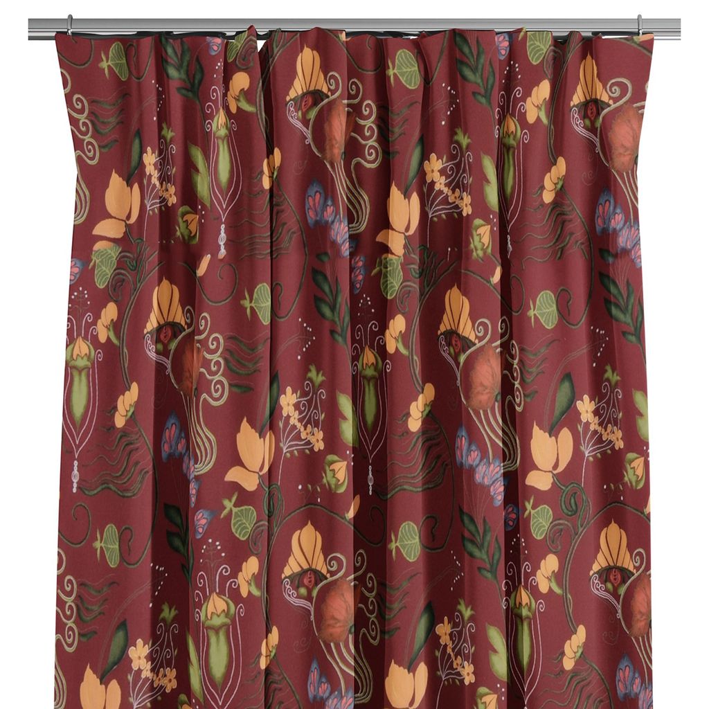 Vinröda gardiner med vackra blommor och kurbits motiv i grönt och gult.