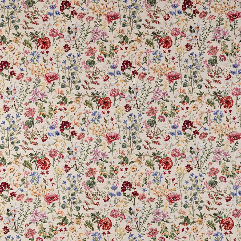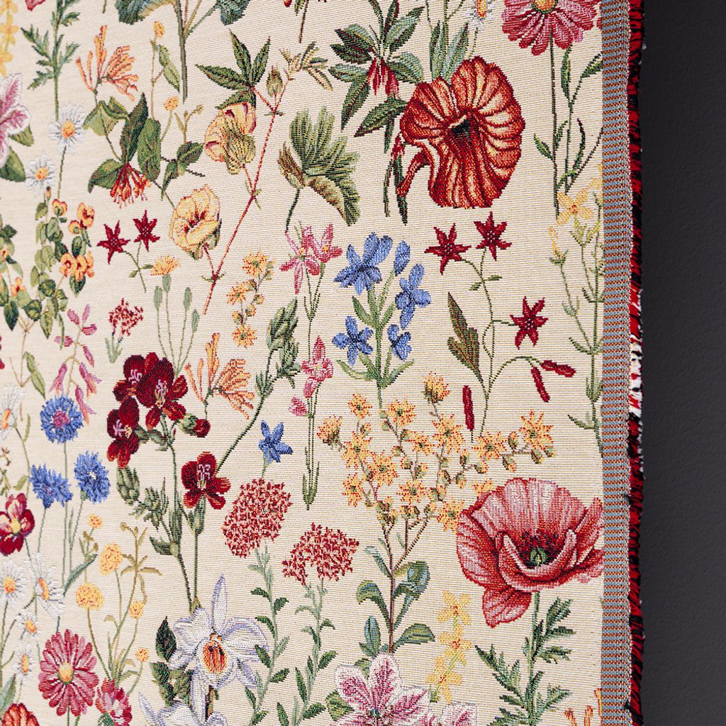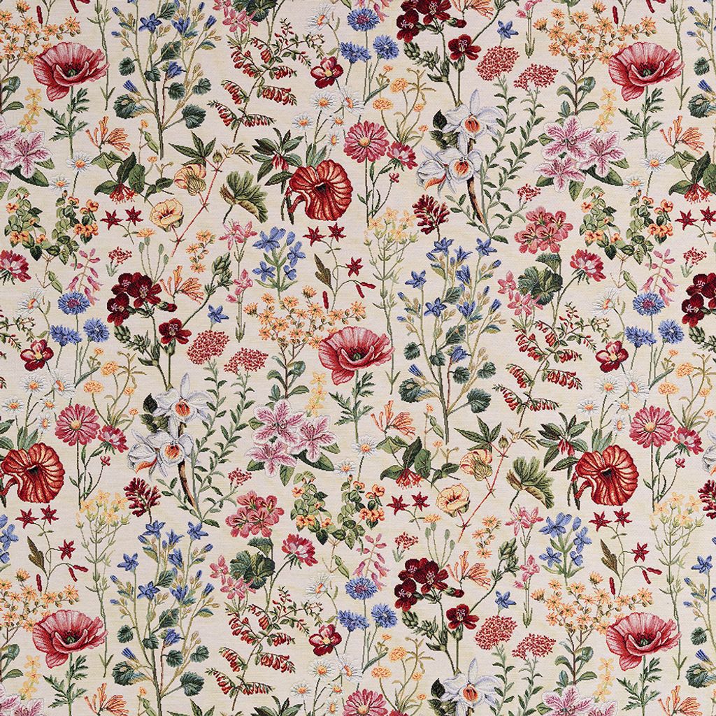 Josephine beige är en vacker gobeläng med ett rikt och botaniskt mönster inspirerat av klassiska blomsterängar. Mot den varma beige botten breder ett detaljrikt flor ut sig i harmoniska toner av rött, rosa, blått, grönt och mjuka naturfärger. Resultatet är ett levande men samtidigt balanserat uttryck som skapar en inbjudande och ombonad atmosfär.