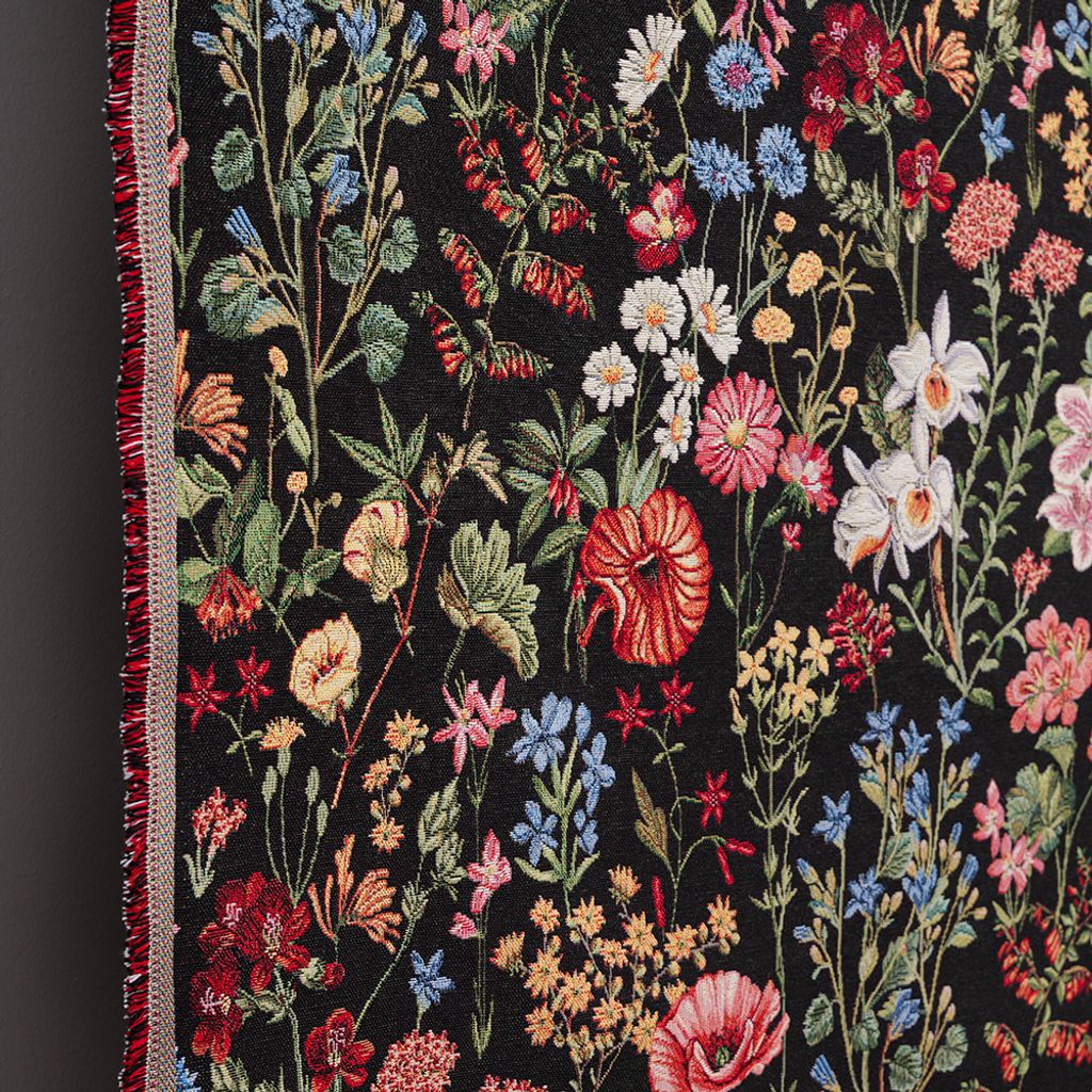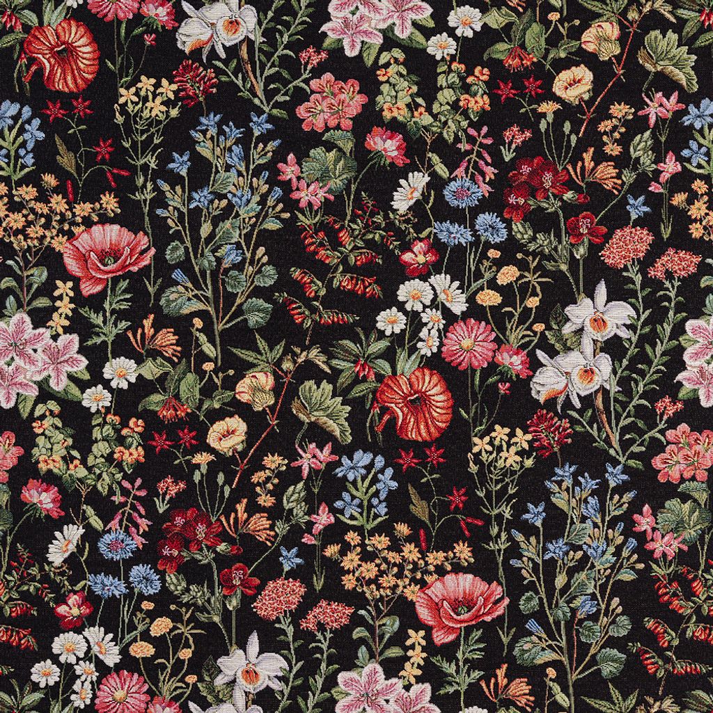 Josephine svart gobeläng är ett exklusivt jacquardvävt möbeltyg med ett romantiskt och botaniskt uttryck. Mot en djup svart bakgrund breder ett rikt blomsterfält ut sig – fylld av vallmo, liljor, små ängsblommor och slingrande gröna stjälkar. Färgerna rör sig mjukt mellan rosa, rött, blått, creme och grönt, vilket skapar en levande men balanserad helhet.