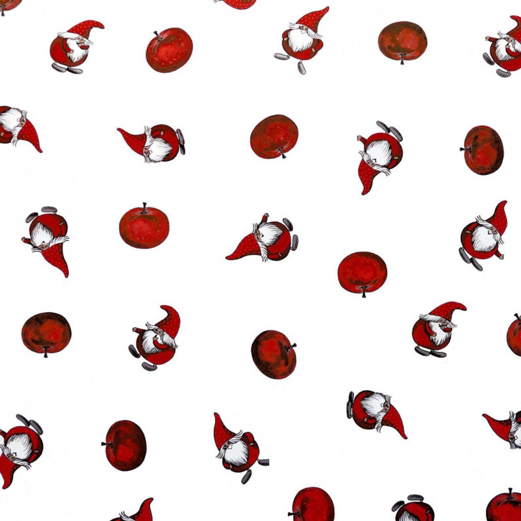 Tyg med vit botten, röda äpplen och söta tomtar tryckt på Arvidssons klassiska bomullsvara.