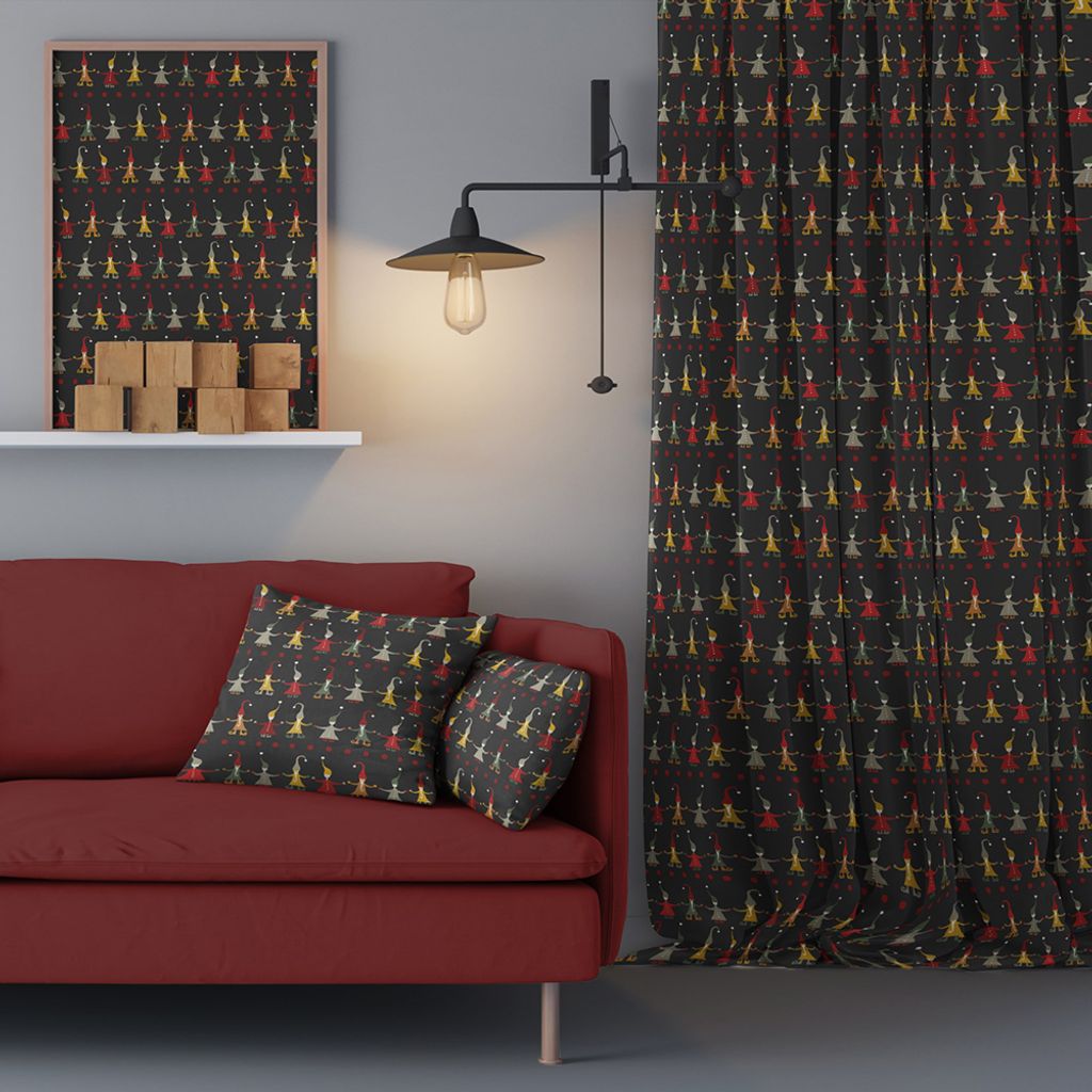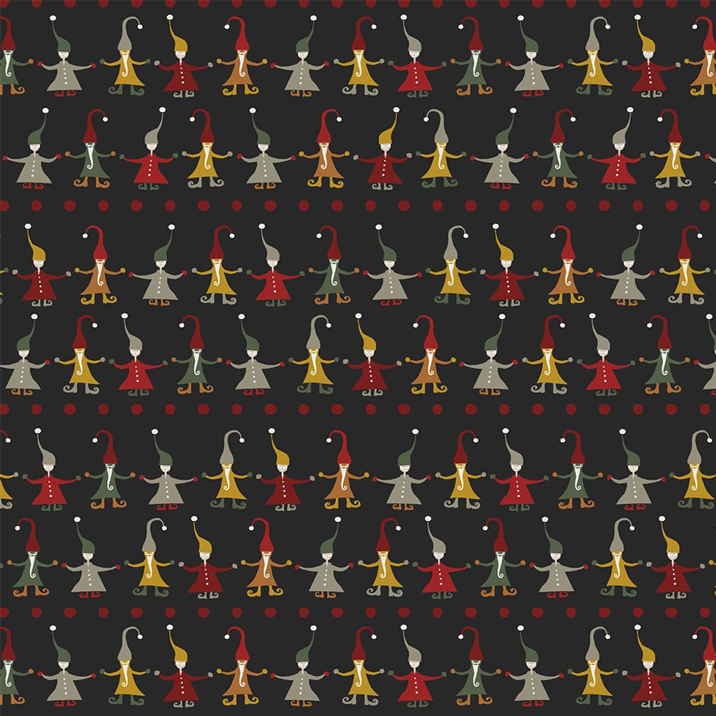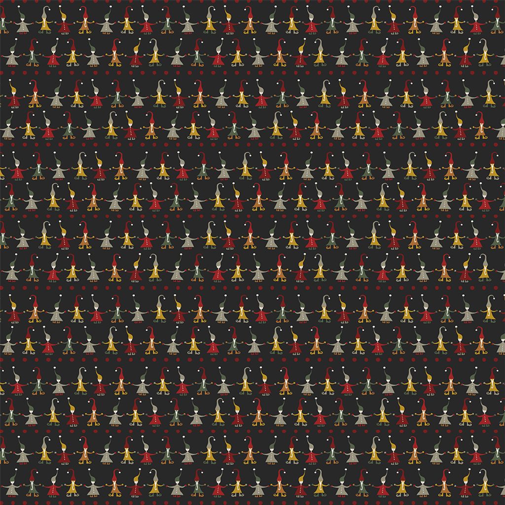Ett småmönstrat tyg med söta tomtar som dansar. Mönstret är tryckt på Arvidssons klassiska bomullsvara. Passar lika bra i hemmet som på kontoret.