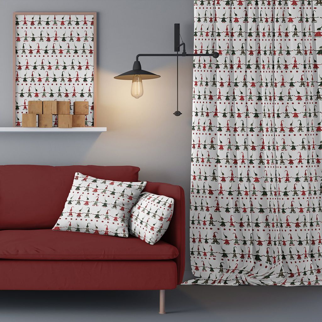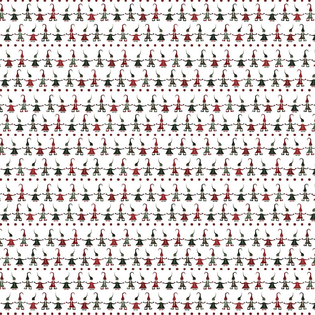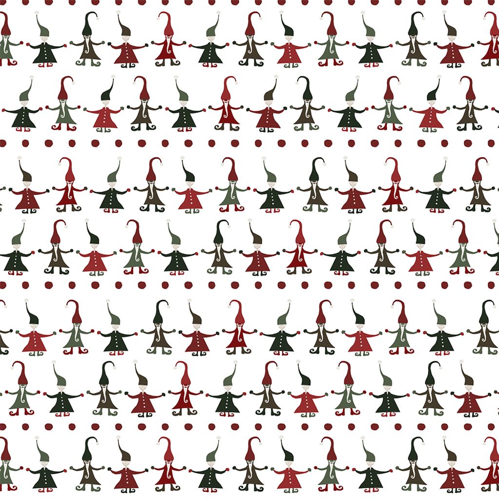 Ett småmönstrat tyg med söta tomtar som dansar. Mönstret är tryckt på Arvidssons klassiska bomullsvara. Passar lika bra i hemmet som på kontoret.