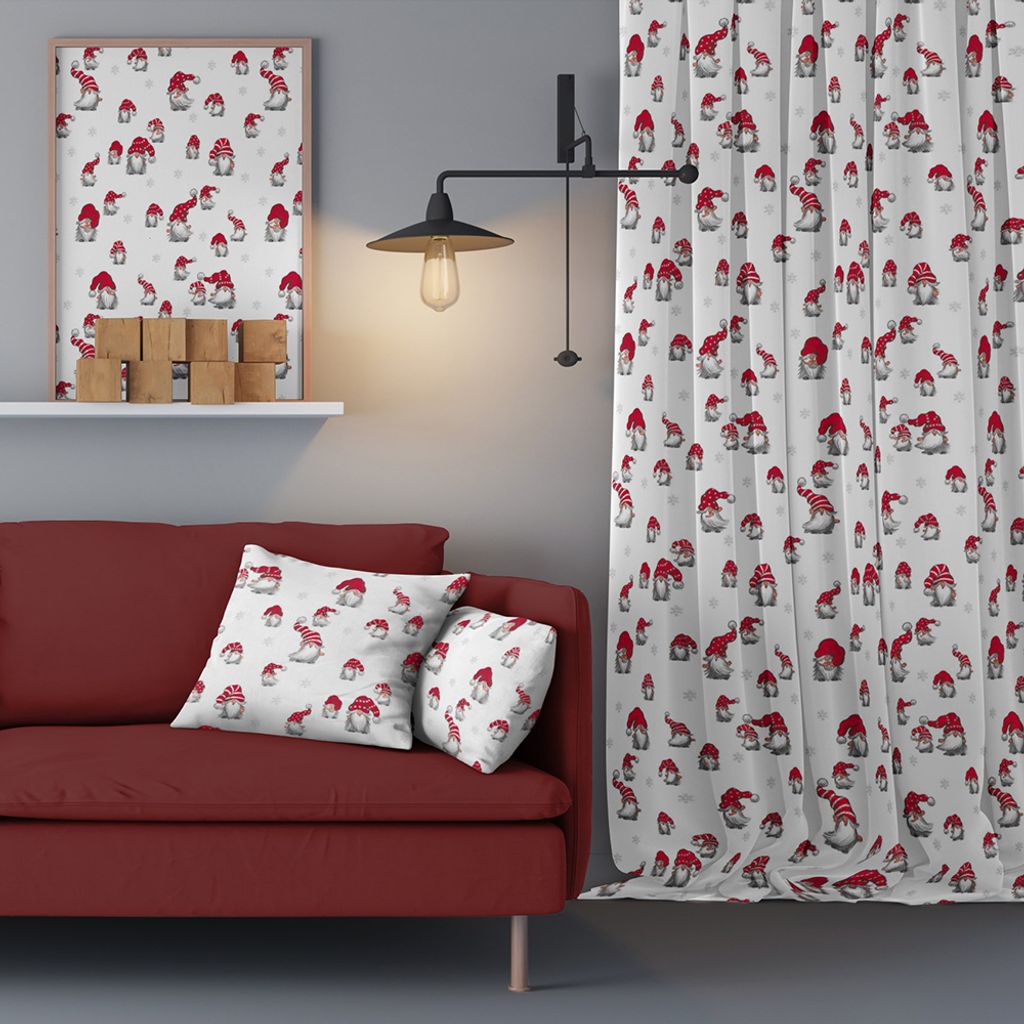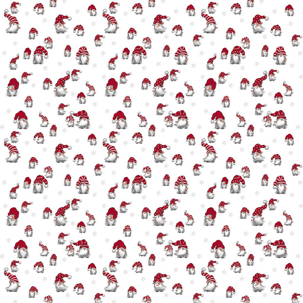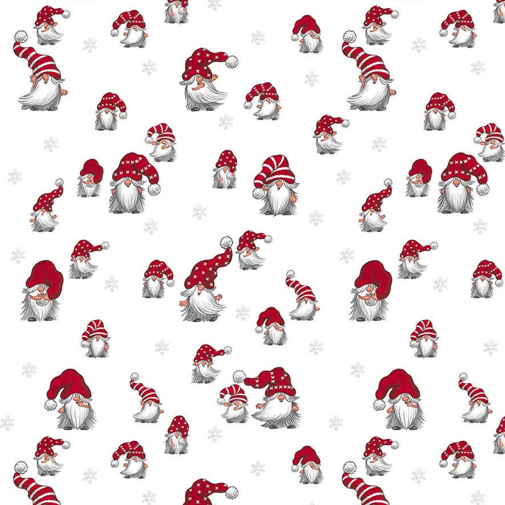 Vitt tyg med söta tomtar med stora röda luvor, klassiska tomtar från Arvidssons. (Bild nr 2 visar hela mönsterbredden på tyget.)