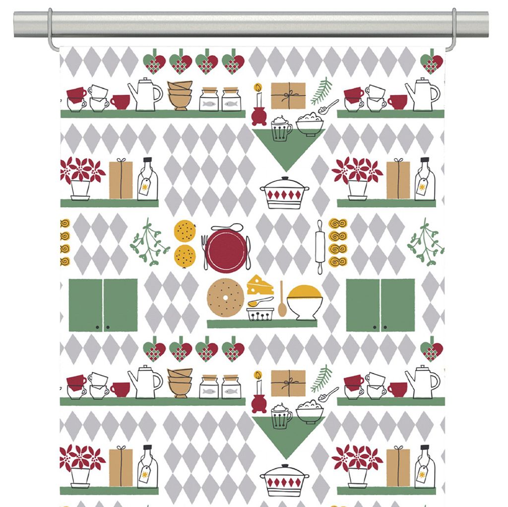 2-pack paneler Tyget Julköket fångar julens glädje och gemenskap. Mönstret har juliga köksdetaljer som bakverk, syltburkar, pepparkakor i färgerna grönt, rött och gult som påminner om traditionella julförberedelser i köket. Panelerna är vita på baksidan.