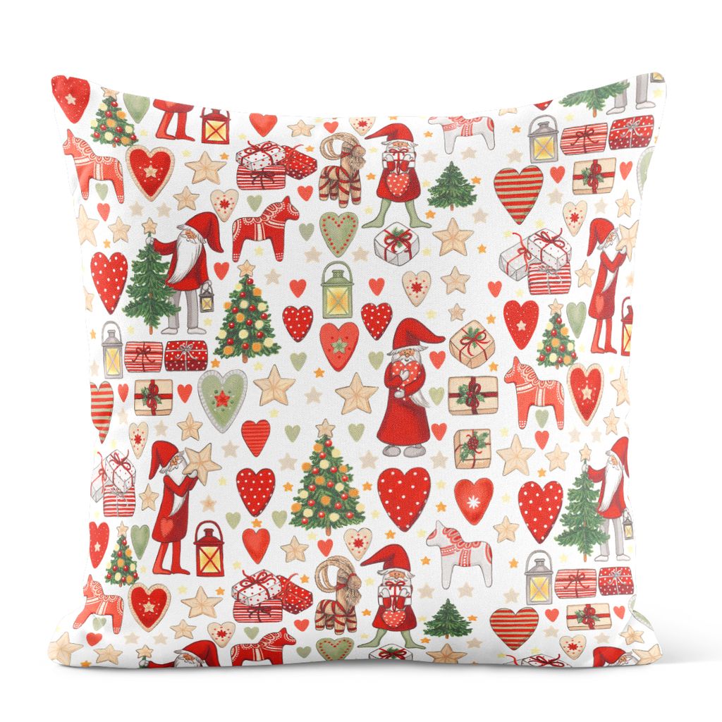 Juligt kuddfodral med rödgröna detaljer – tomtar, granar, hjärtan och pepparkakor som sprider glädje i soffan! Mönsterplaceringen varierar, vilket gör varje kuddfodral unikt. Innerkudde ingår ej!
