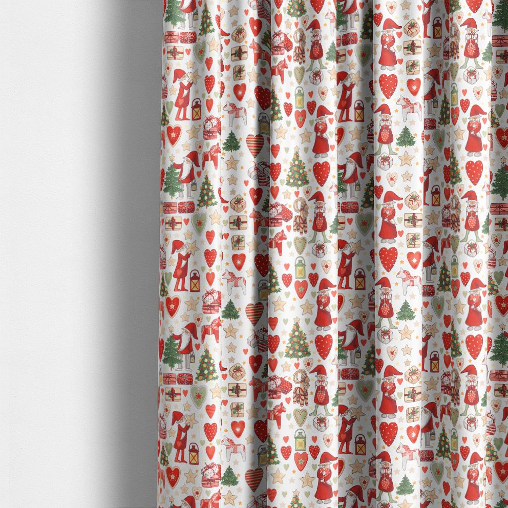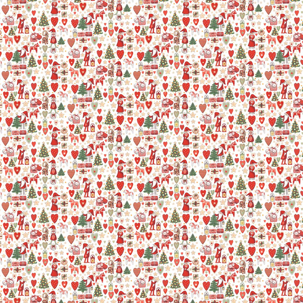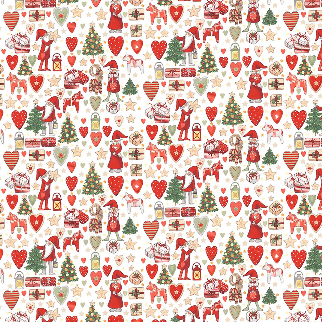 Ett lekfullt julmönster med tomtar, dalahästar, paket och granar i klassiska röttoner – perfekt för julens alla projekt.