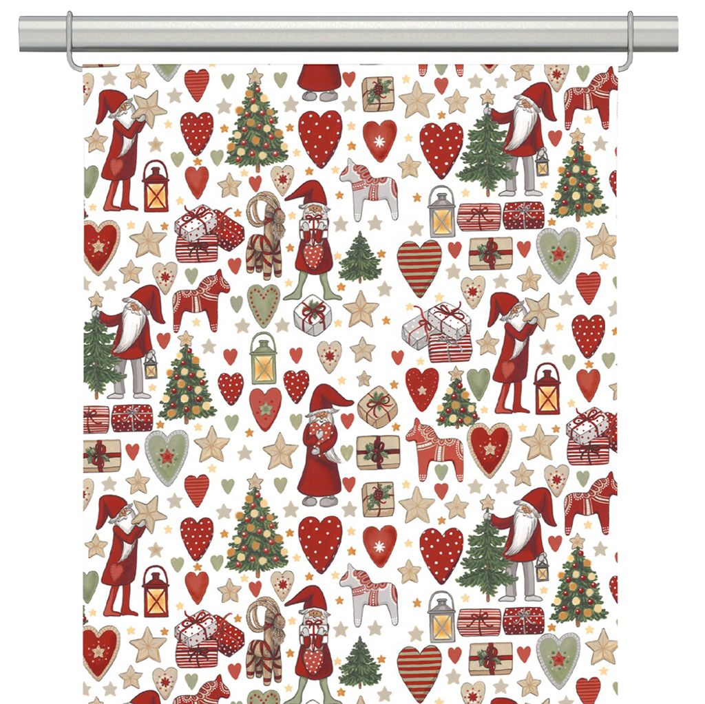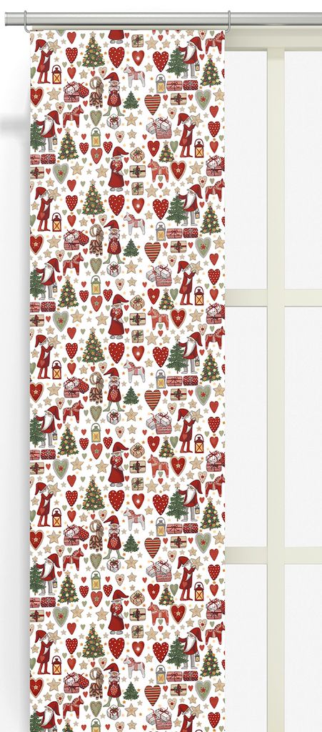 2-pack panelgardiner med rödgröna detaljer – tomtar, granar, hjärtan och pepparkakor som sprider glädje!